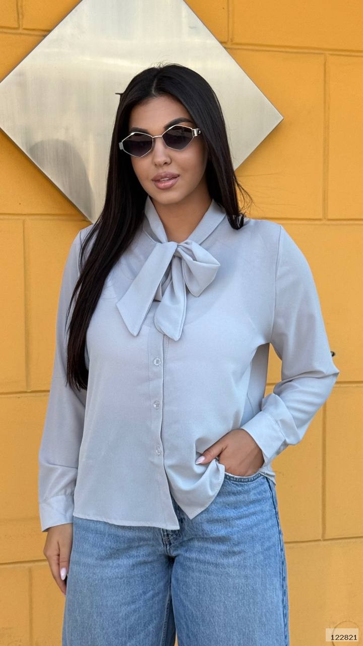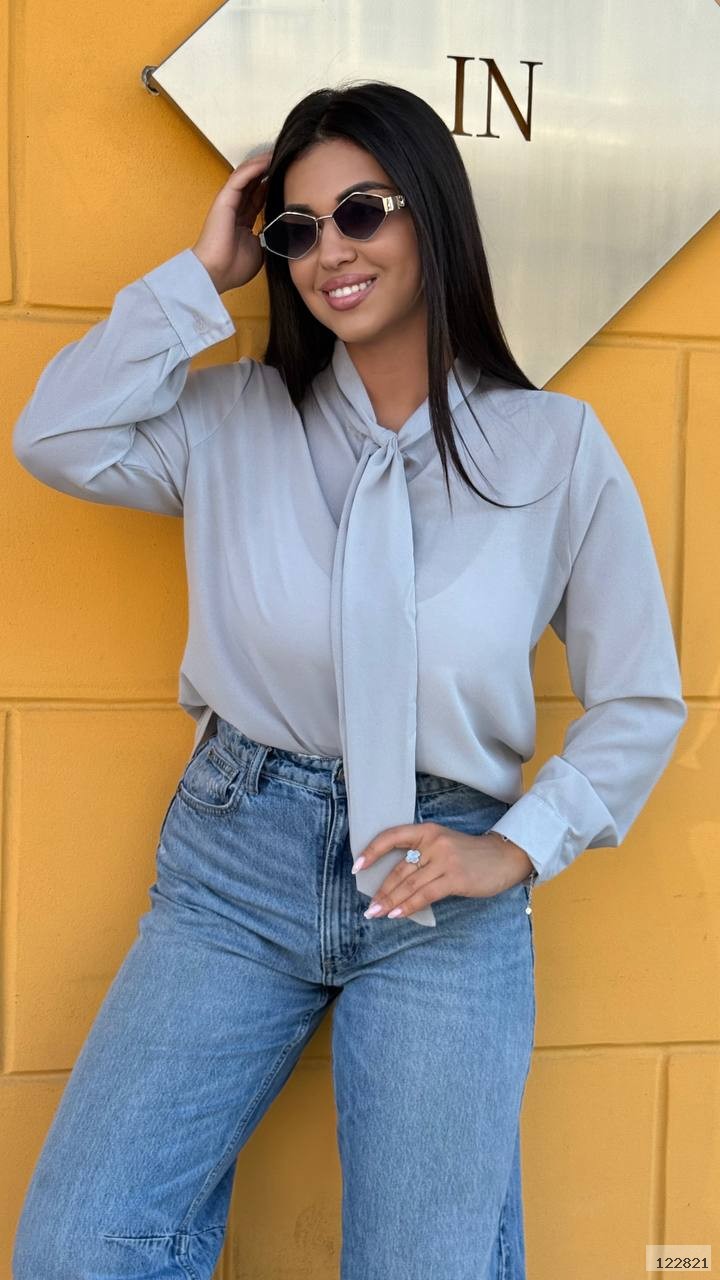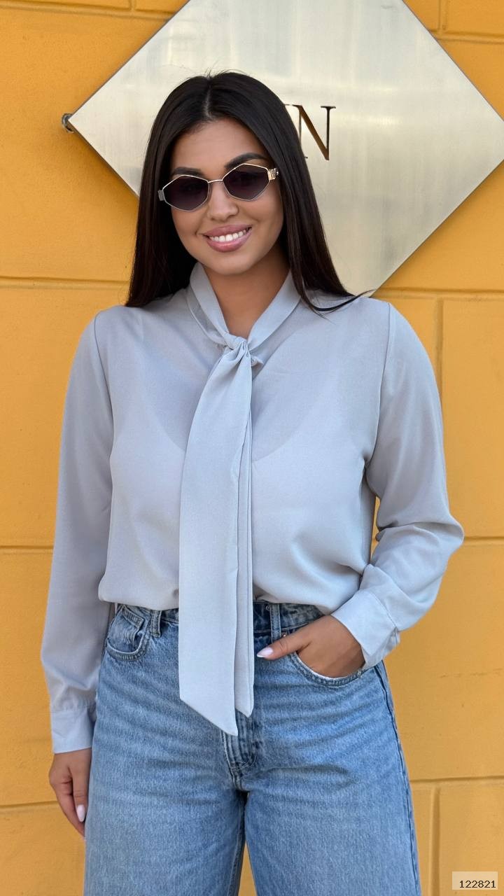 Ніжна та жіночна блуза з креп шифону на ґудзиках. Комірець переходить в бант.