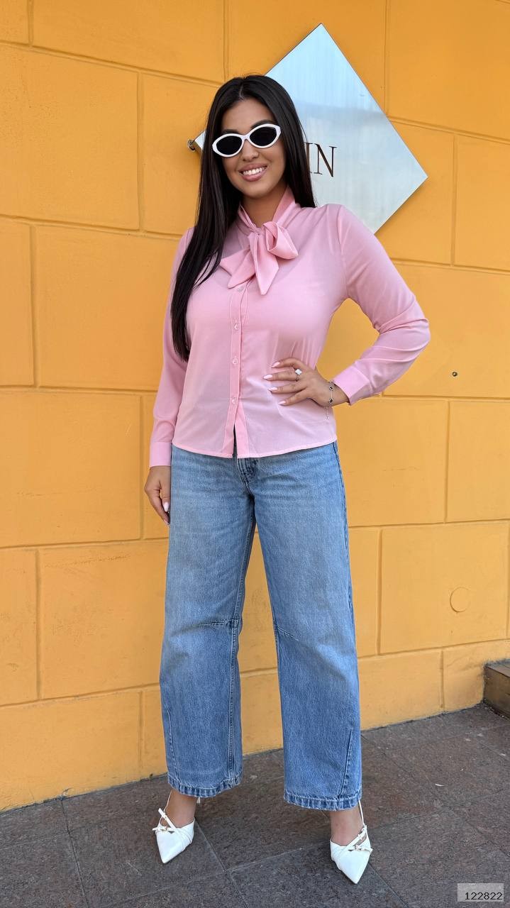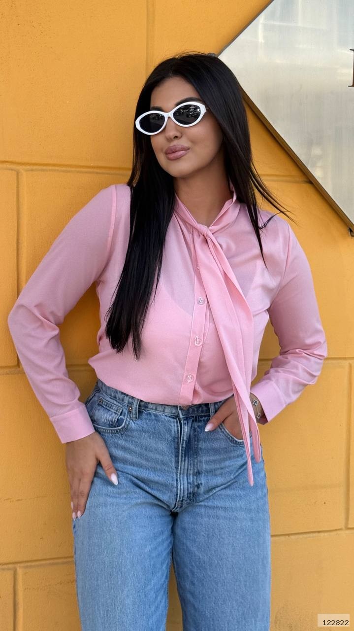 Ніжна та жіночна блуза з креп шифону на ґудзиках. Комірець переходить в бант.