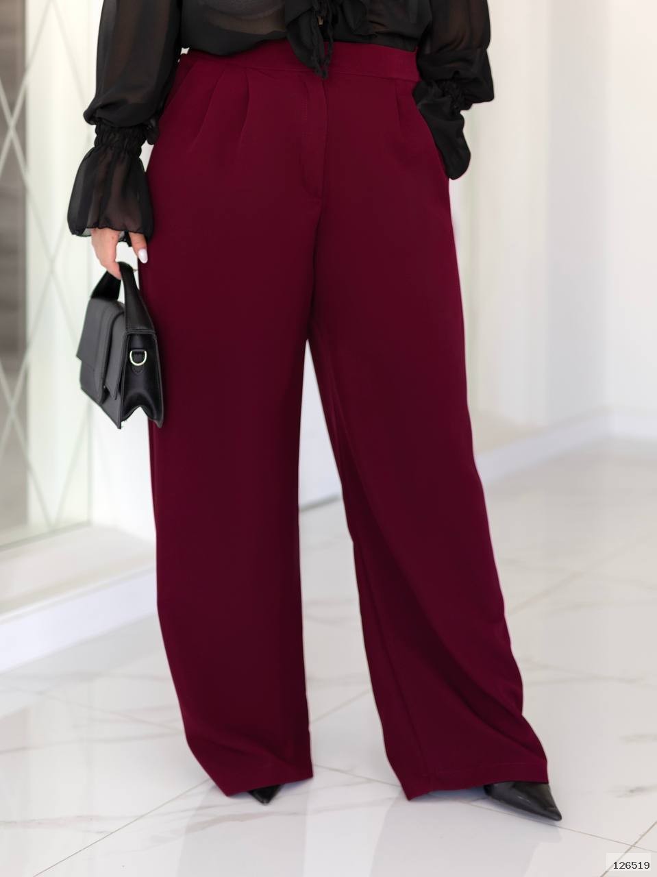 Ці стильні штани із костюмної тканини ідеально підійдуть для створення елегантного та комфортного образу. Вільний крій із широкими брюками візуально витягує силует, а м'який матеріал забезпечує зручну посадку. Висока посадка із защипами додає елегантності та підкреслює талію. Ідеально поєднуються як із класичними туфлями, так і з кедами для більш розслабленого стилю. Відмінний вибір для офісу, прогулянок чи особливих випадків! Штани мають кармани, застібка- блискавка та ґудзик. По спинці на талії іде резинка для кращої посадки.