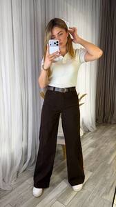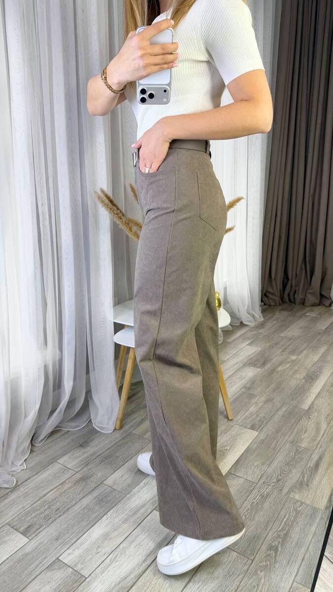 Штани з мʼякої еластичної тканини, тягнуться, з двома кишенями попереду, позаду 1 кишеня, застібаються на ґудзик та блискавку.