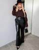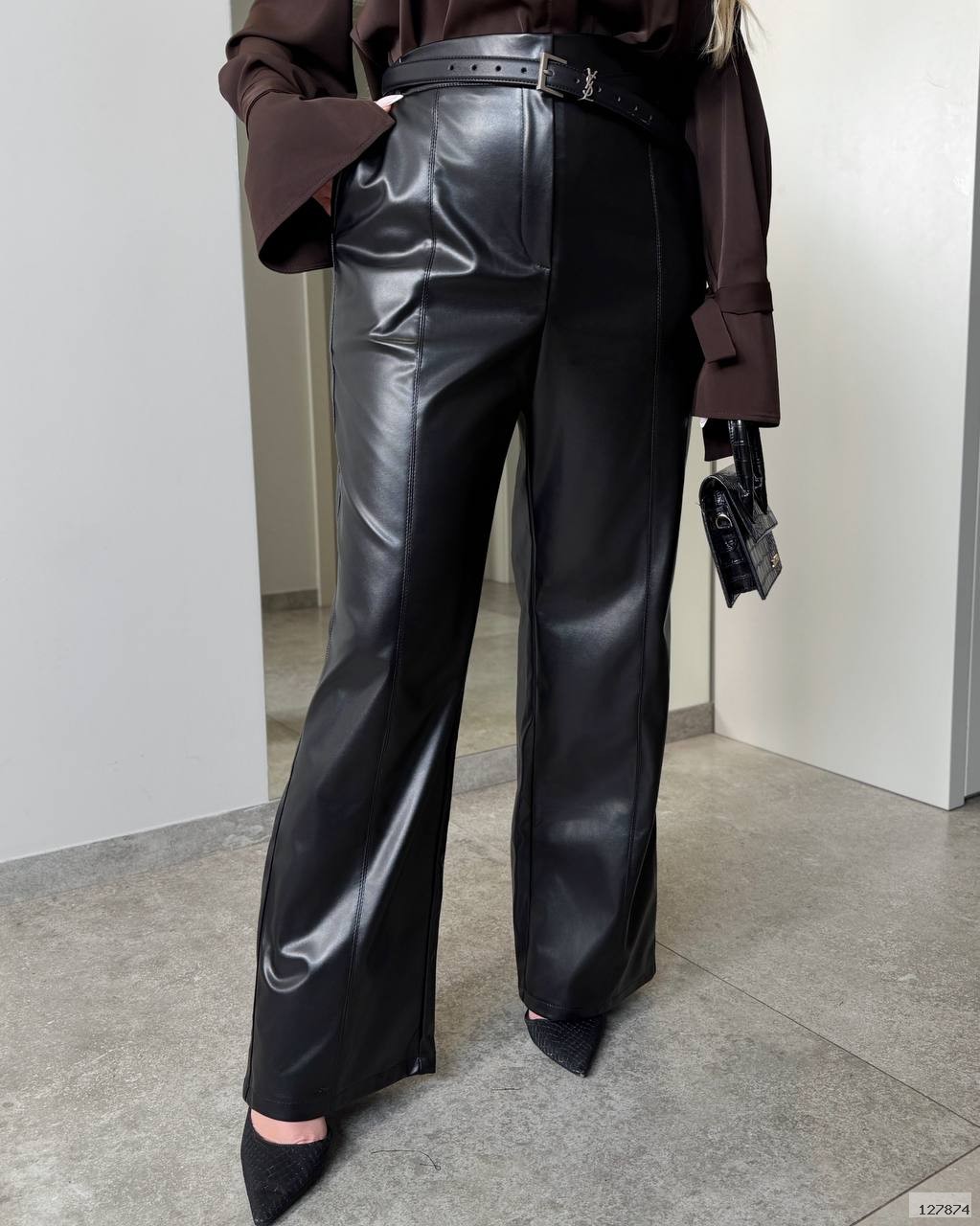 БРЮКИ ПРЯМОГО КРОЮ з еко шкіри на байковій основі Брюки високої посадки з косими кишенями. Зі строчкою по переду. Пояс частково на резинці, застібка гачок.