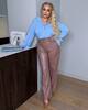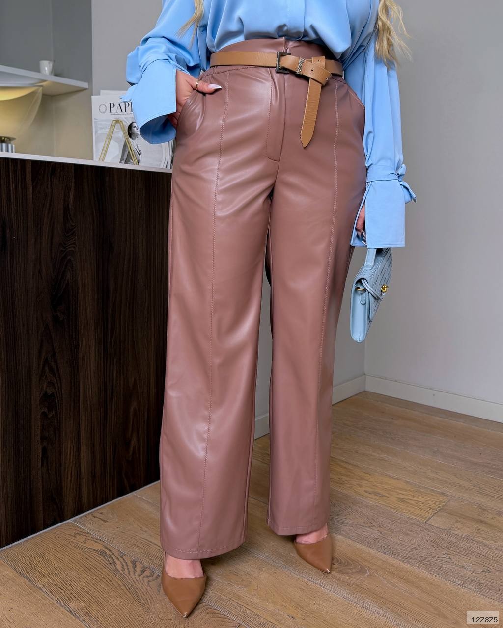 БРЮКИ ПРЯМОГО КРОЮ з еко шкіри на байковій основі Брюки високої посадки з косими кишенями. Зі строчкою по переду. Пояс частково на резинці, застібка гачок.
