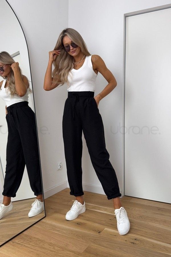 Штани, з високою посадкою, позаду резиночка, завдяки якій гарно лягають по фігурі, збоку змійка, на поясі шнурок- знімається. Кармани працюючі. Довжину можна регулювати під різний ваш стиль.