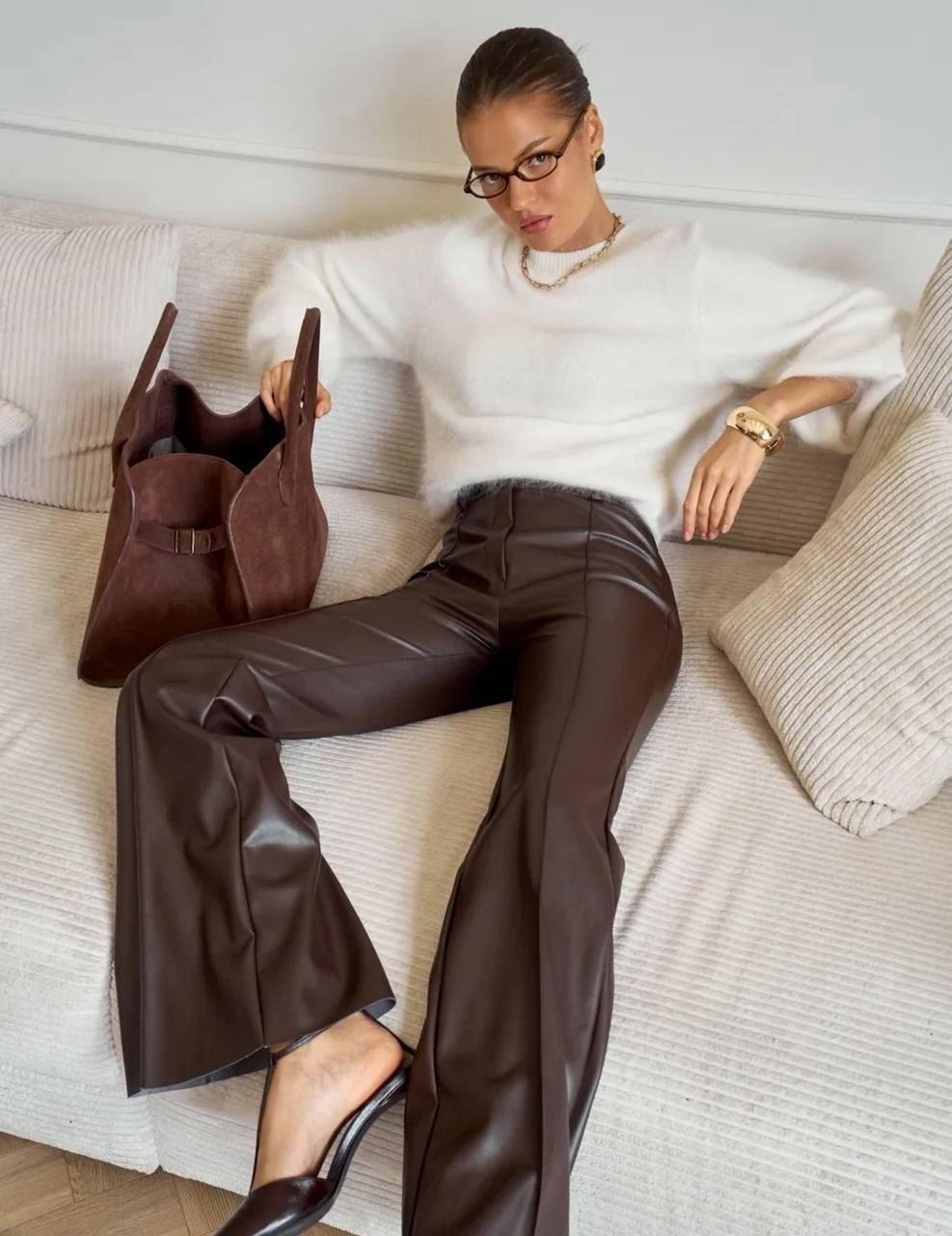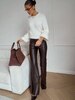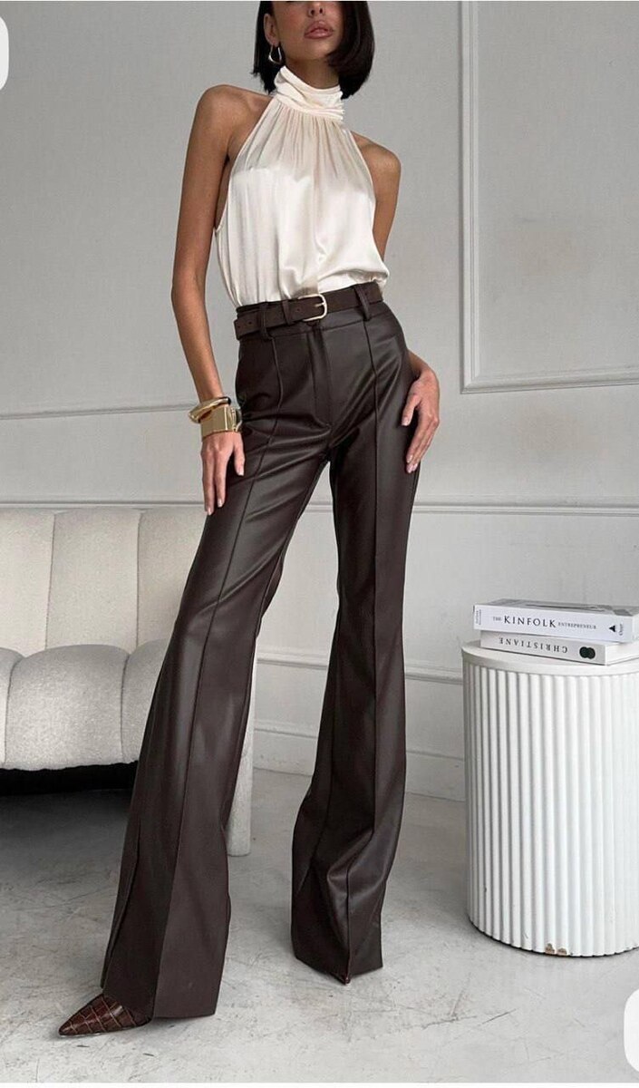 Жіночі брюки з екошкіри з високою посадкою — стильна та трендова модель для створення ефектних образів. Виконані з якісної екошкіри, приємної на дотик, добре тримає форму та красиво сідає по фігурі. Висока посадка візуально подовжує ноги й підкреслює талію. Позаду пояс на резинці для ідеальної посадки. Лаконічний дизайн без кишень додає елегантності та мінімалізму. Ідеально поєднуються як з базовими речами, так і з яскравими акцентами.