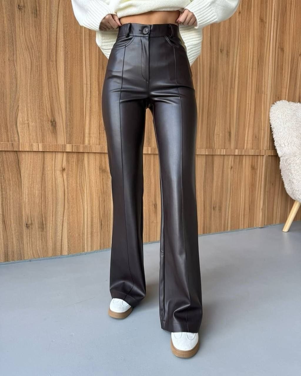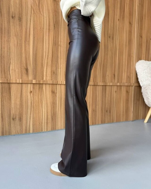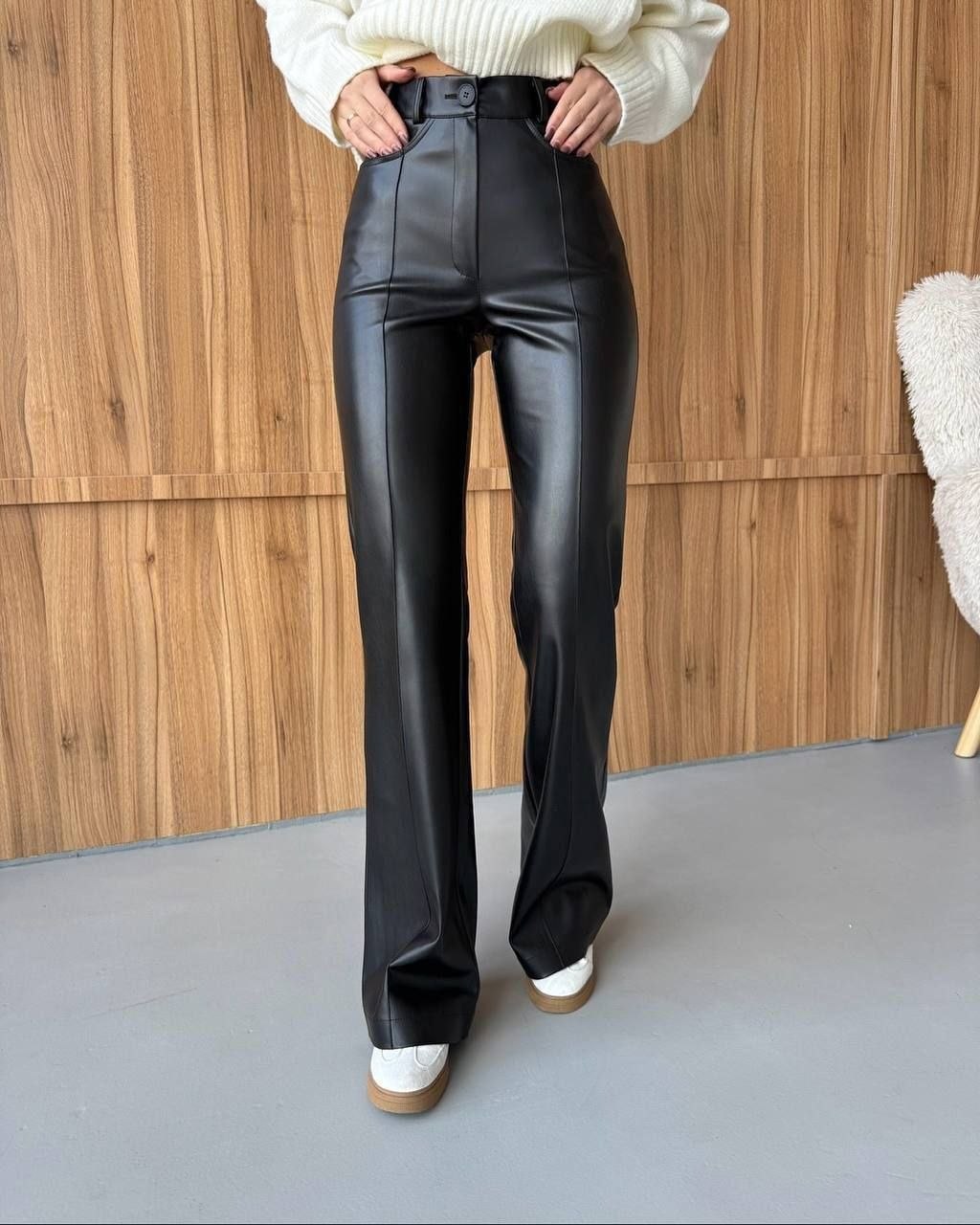Жіночі брюки з екошкіри з високою посадкою — стильна та трендова модель для створення ефектних образів. Виконані з якісної екошкіри, приємної на дотик, добре тримає форму та красиво сідає по фігурі. Висока посадка візуально подовжує ноги й підкреслює талію. Позаду пояс на резинці для ідеальної посадки. Лаконічний дизайн без кишень додає елегантності та мінімалізму. Ідеально поєднуються як з базовими речами, так і з яскравими акцентами.
