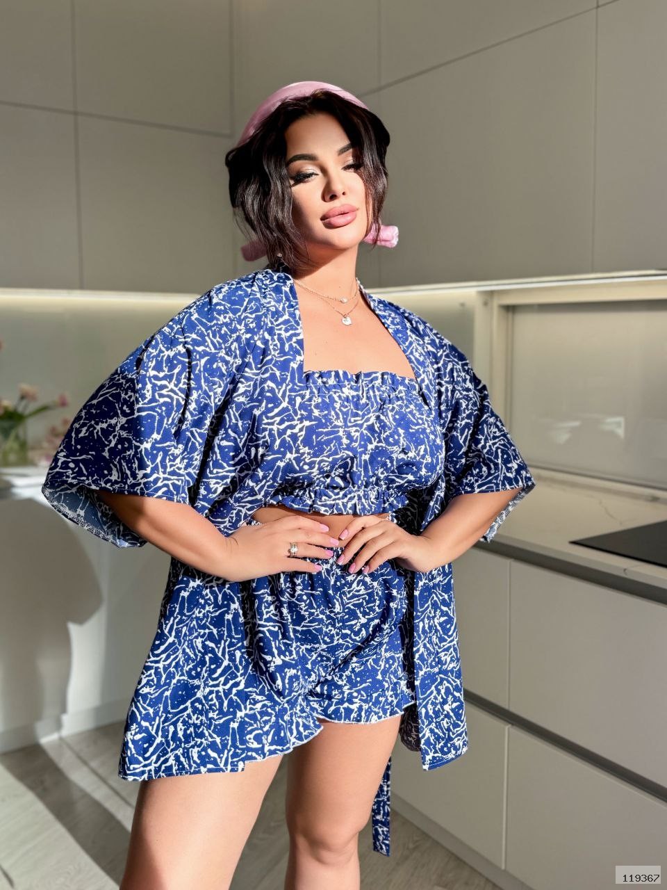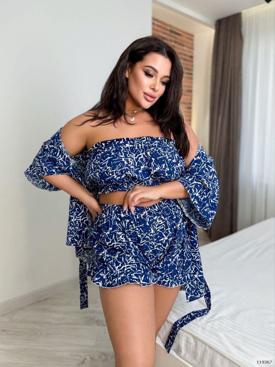 54-56 Довжина халата - 90 см, Довжина рукава - 33 см, Об'єм грудях ТОПу - 132 см, Висота ТОПу - 36 см, Об'єм талії шорт - 86 см (розтягується до 136 см), Об'єм стегон шорт - 136 см, Довжина шорт по боковому шву - 33 см