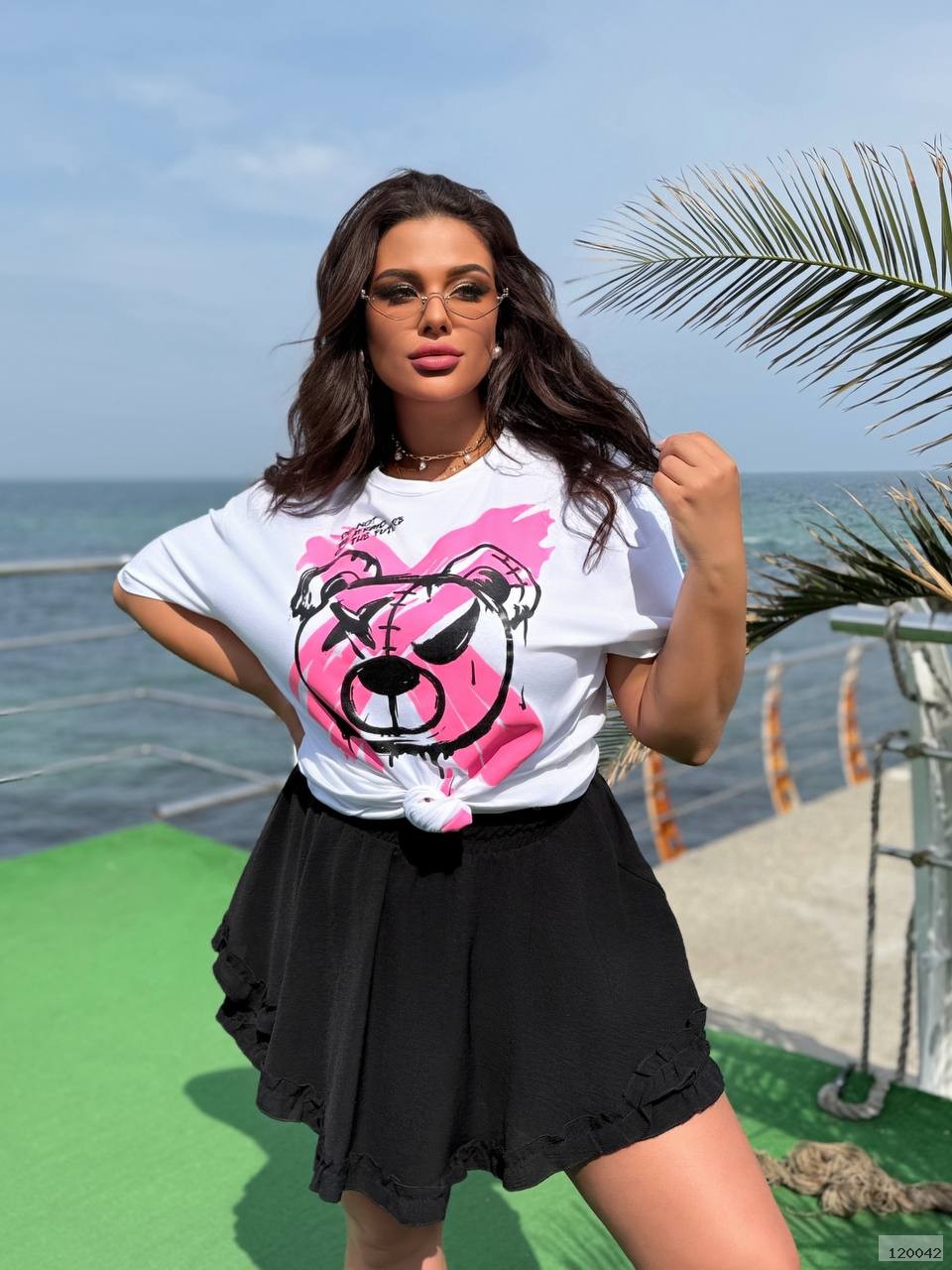 Футболка в базових кольорах з яскравим принтом який ідеально поєднується з кольором футболки і виглядає дуже стильно,з нею ви з легкістю зможете створити свій ідеальний лук)