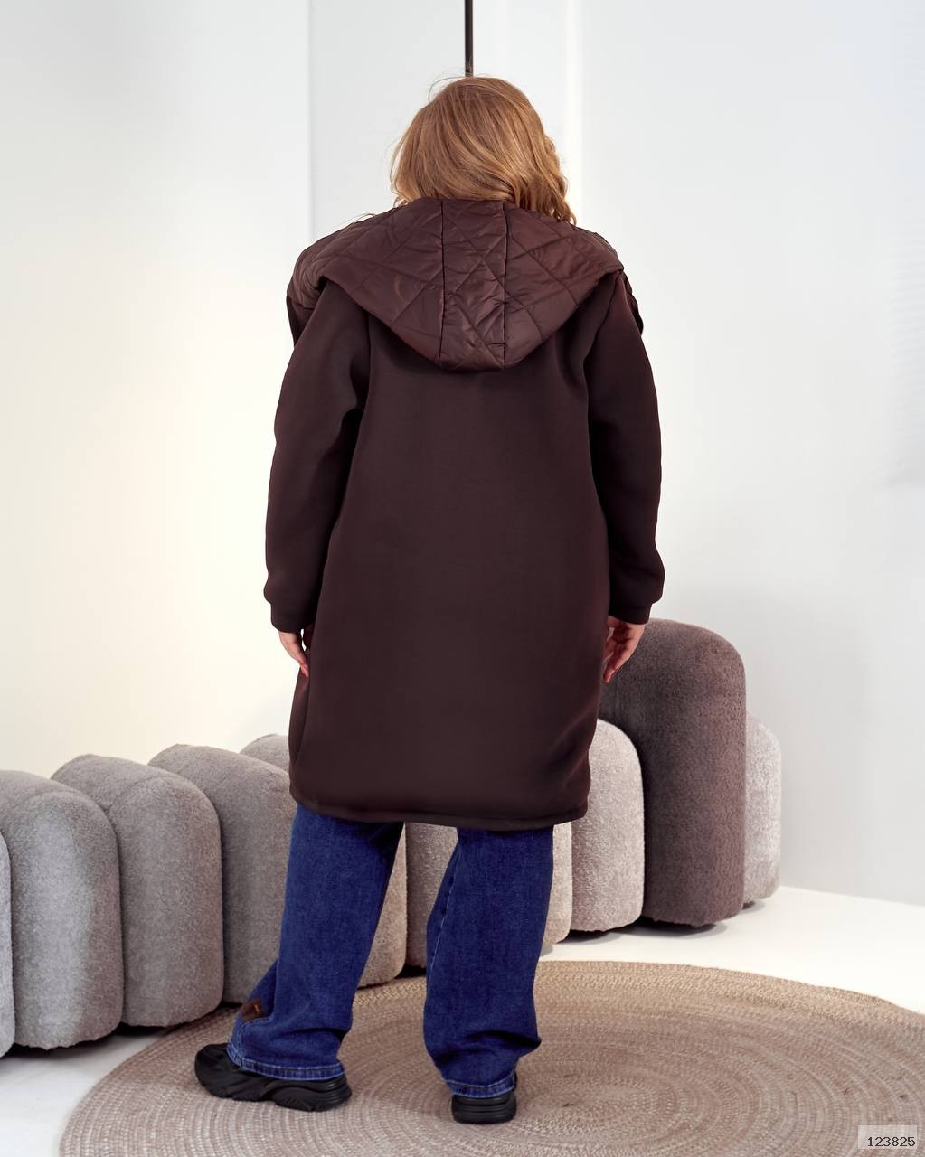 Стильний кардиган прямого крою виконаний із двох видів тканини. Перед асиметричний, зручний глибокий капюшон, кишені.