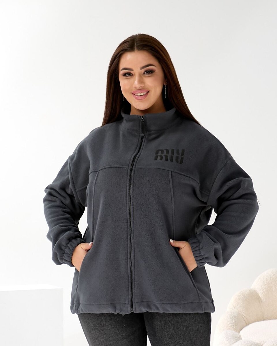 Комірець-стійка.Застібка на блискавці,по низу виробу резинка на стопорах,дає можливість стягувати низ кофти,або носити прямий силует.Рукава по низу на резинці.