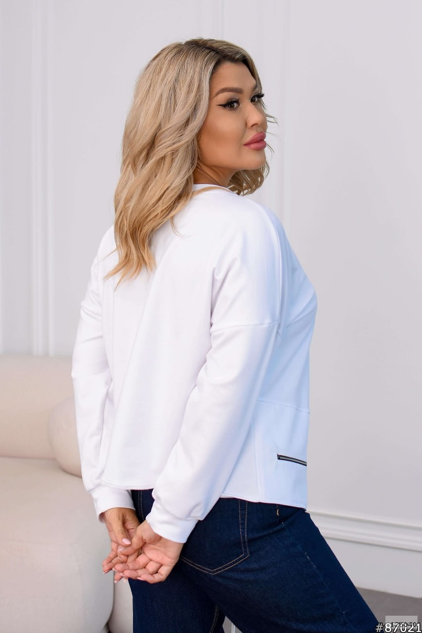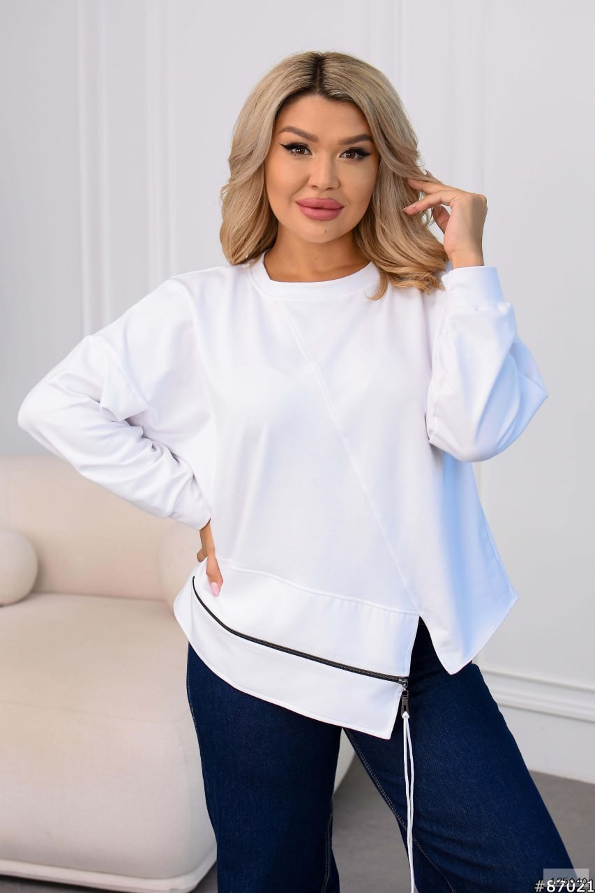 Кофта вільного, цікавого крою : по низу вставка з крепкостюмки , прикрашена молнією з канатом в колір основи . На рукавах манжети . Цікавий крій , який приховує недоліки фігури