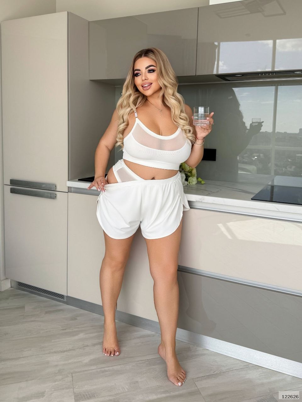 Топ +шорти+стрінги. Топ зі вставками сітки, під грудьми щільна гумка. Шорти, вільні з розрізами з боків, на поясі гумка, Стрінги Бразилії на щільній гумці, зі вставками сітки