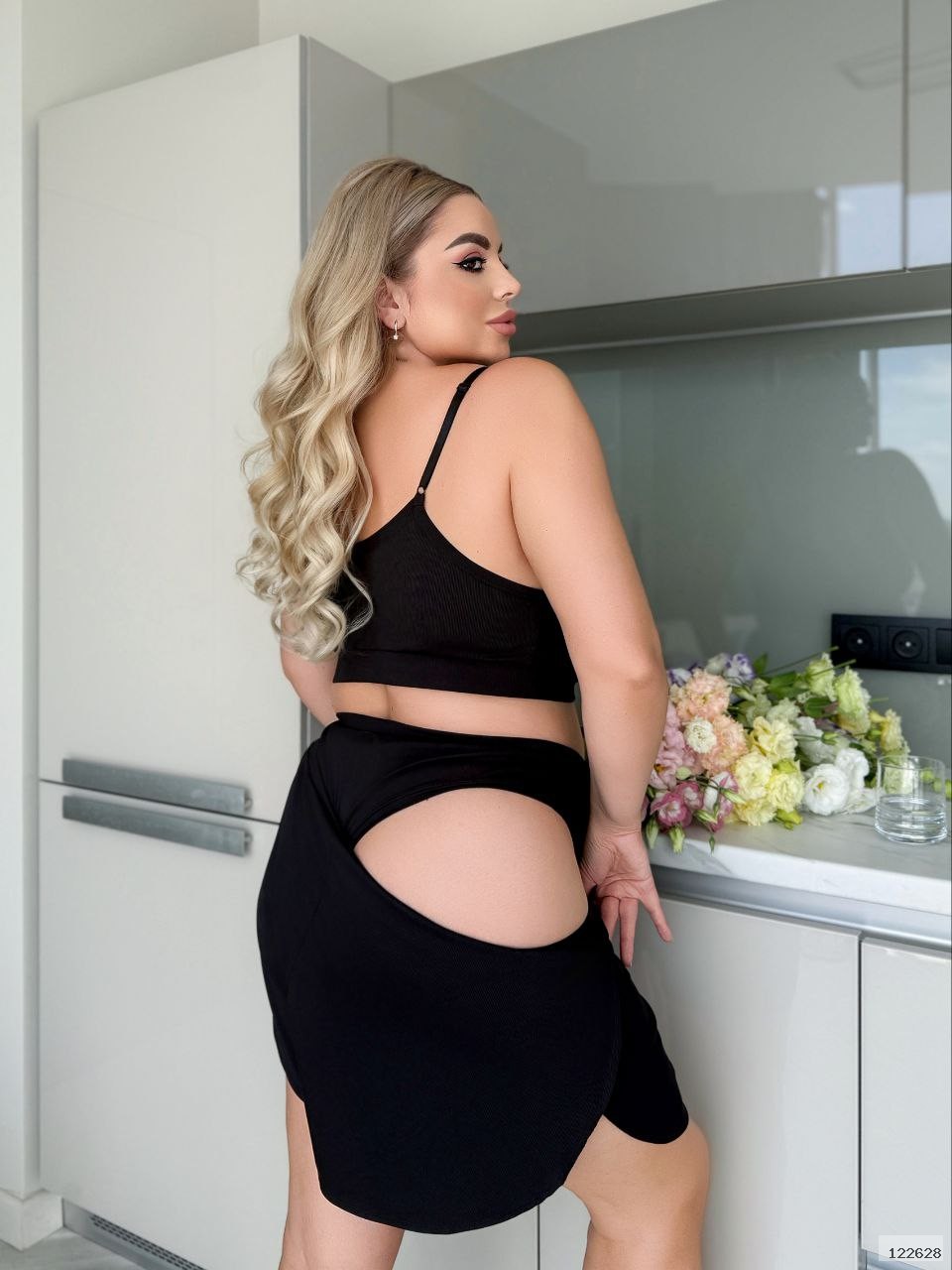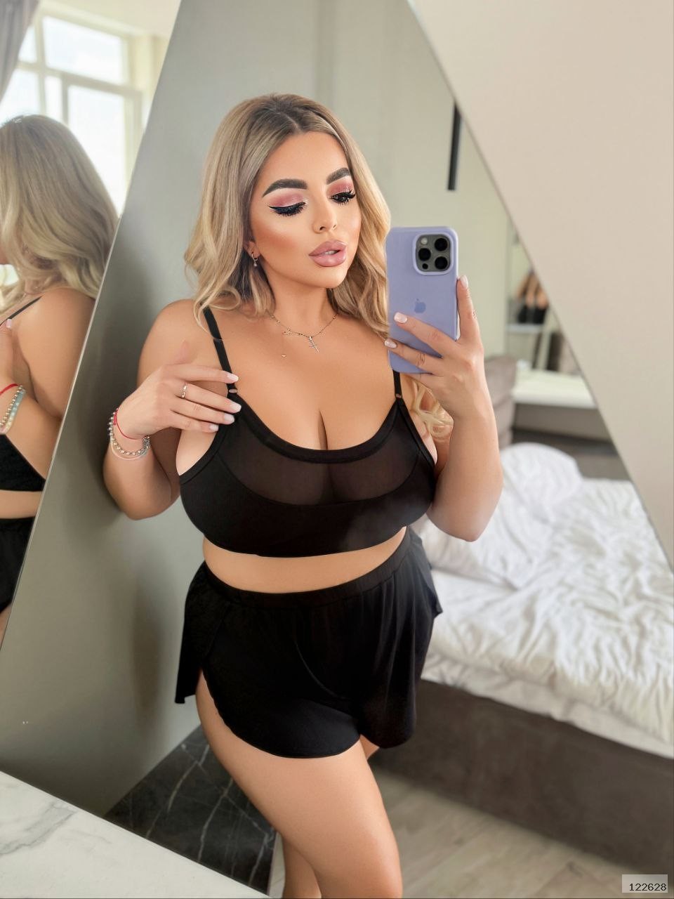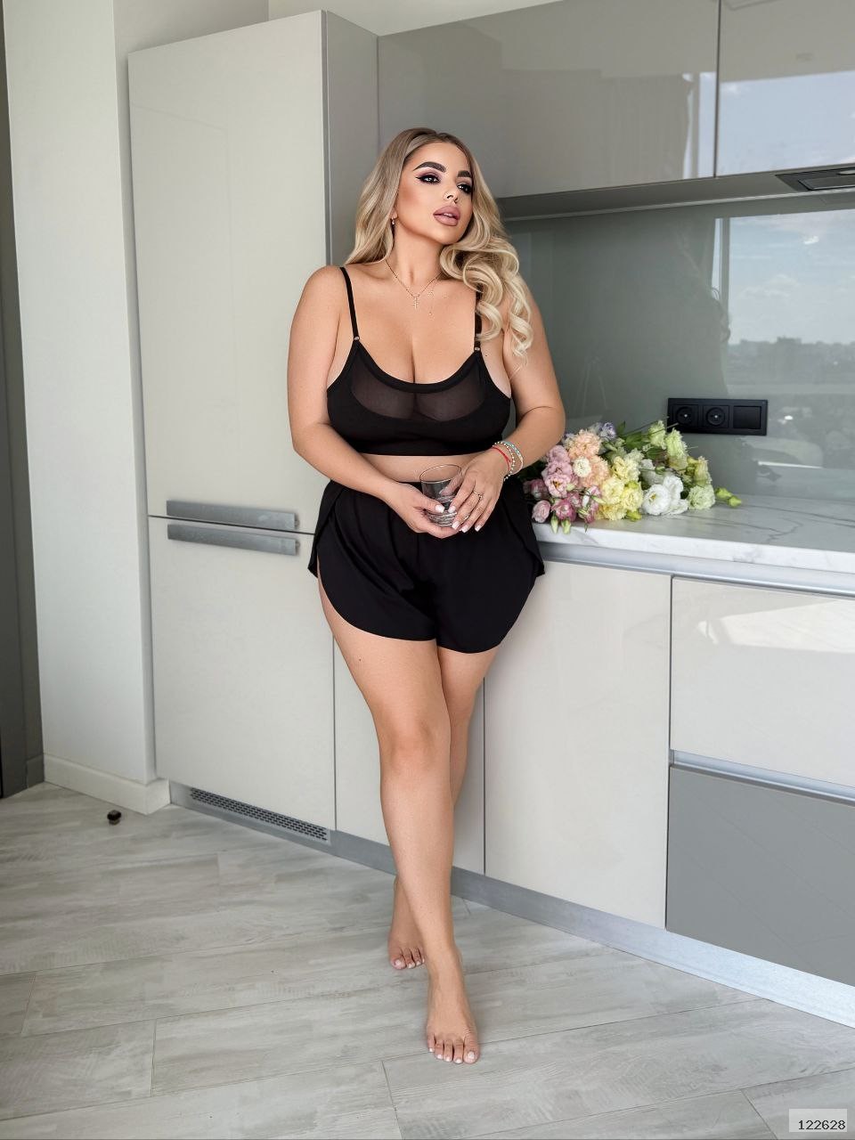 Топ +шорти+стрінги. Топ зі вставками сітки, під грудьми щільна гумка. Шорти, вільні з розрізами з боків, на поясі гумка, Стрінги Бразилії на щільній гумці, зі вставками сітки