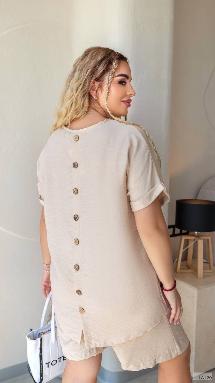 Футболка вільного крою. Спинка декорована ґудзиками. Ззаду футболка довша, перед коротший