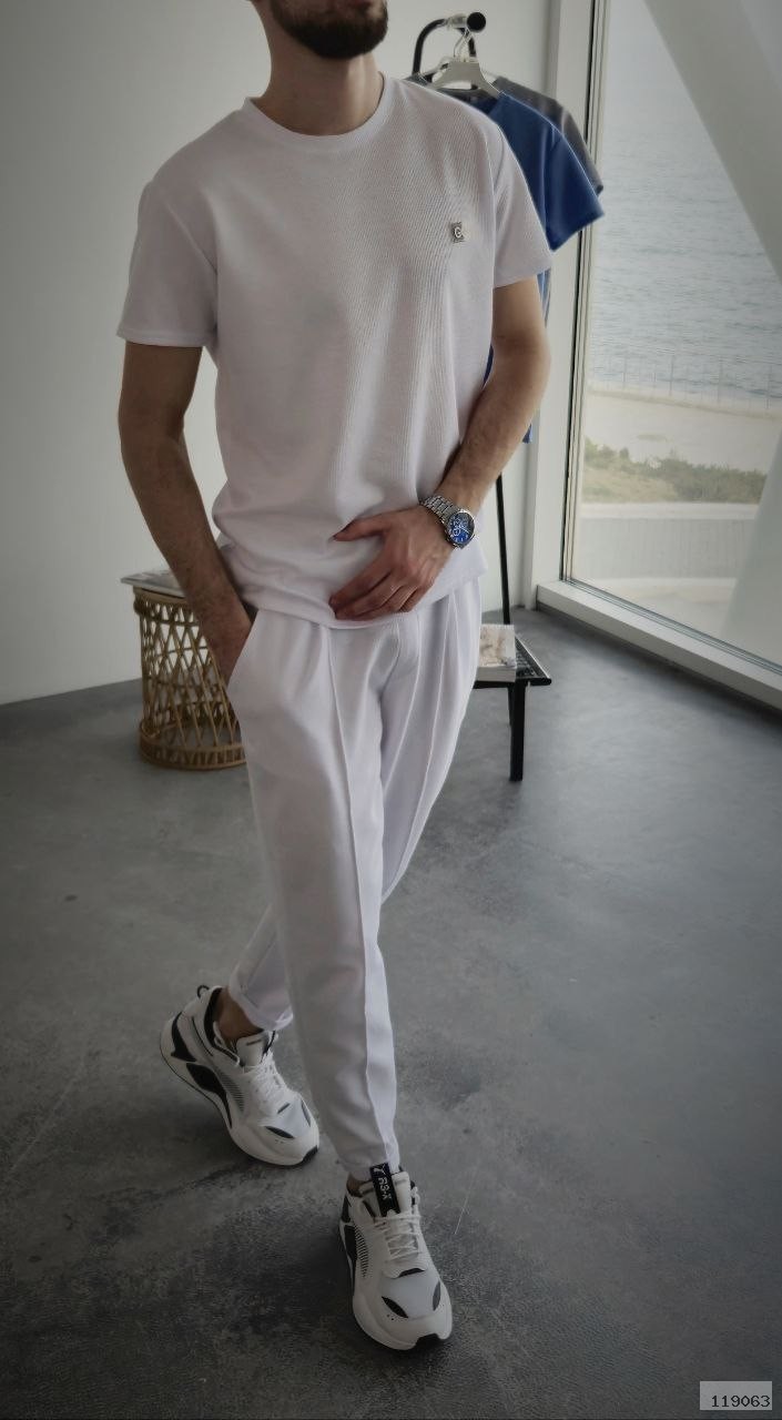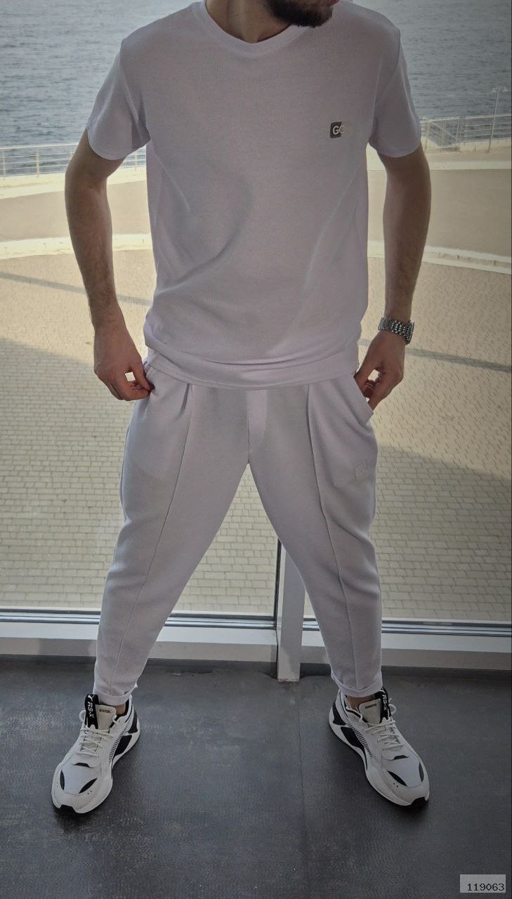 Футболка з фактурною текстурою,декорована силіконовою нашивкою на груднях.Штани з еластичним поясом,шнурком,бічними кишенями та силіконовою нашивкою.