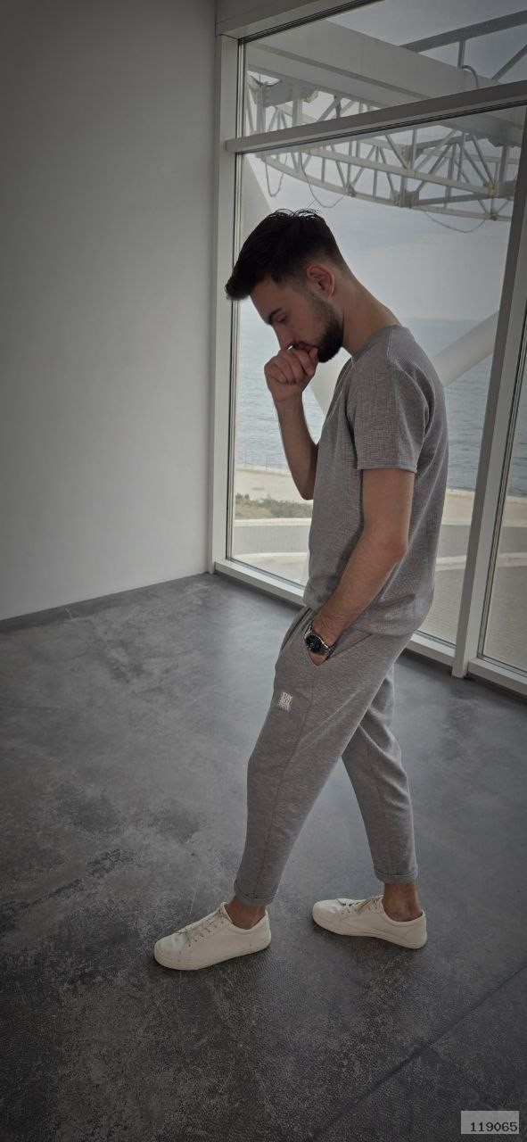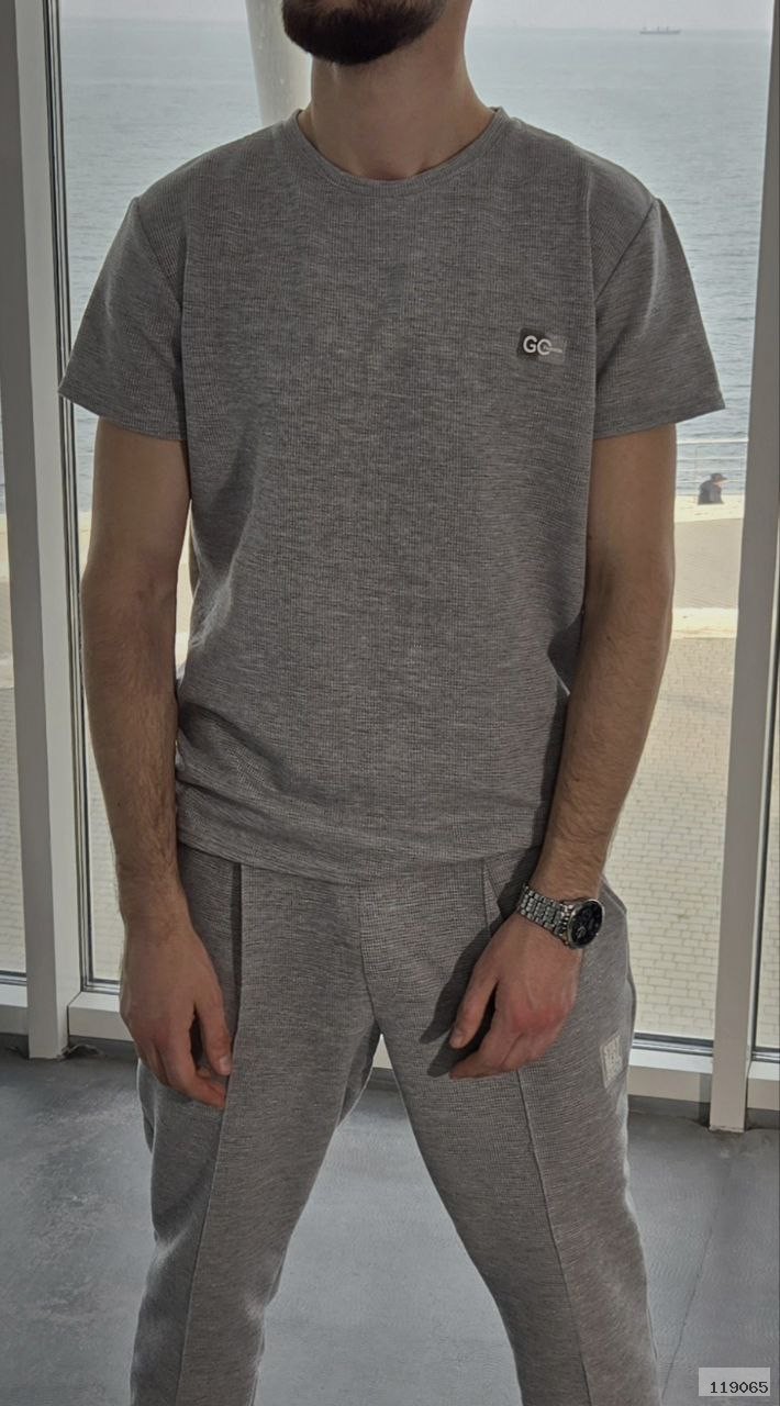 Футболка з фактурною текстурою,декорована силіконовою нашивкою на груднях.Штани з еластичним поясом,шнурком,бічними кишенями та силіконовою нашивкою.