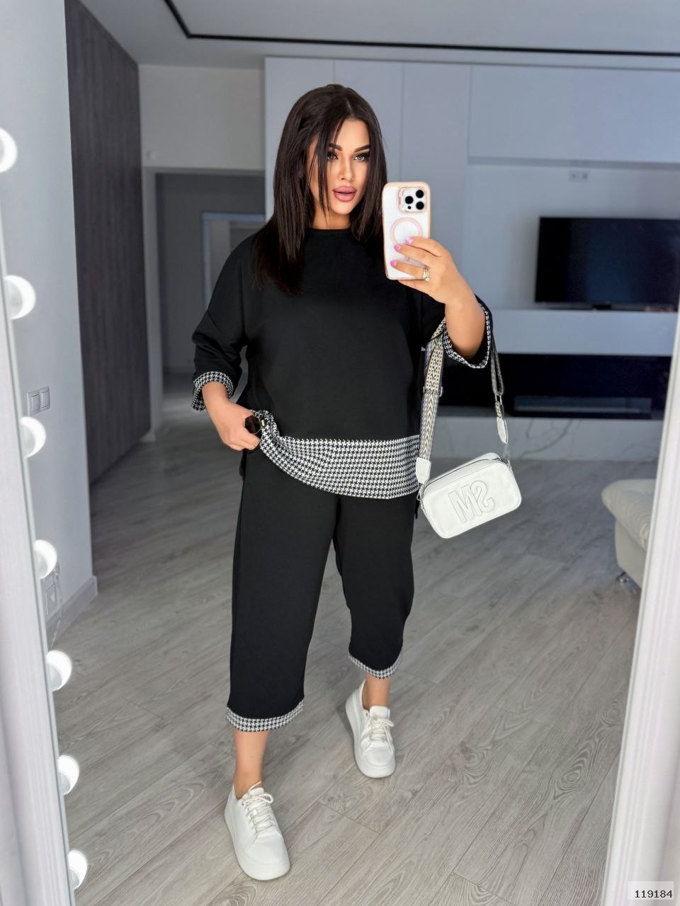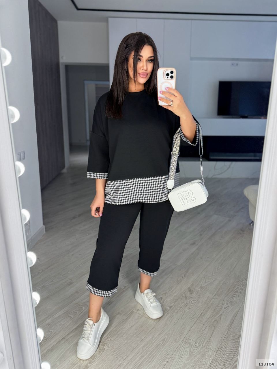 Костюм виконаний з якісної двунитки. Туніка вільного крою, штани 7/8, пояс на резинці, висока посадка, бокові кишені. Вставки трикотаж лапка, м'який та приємний до тіла.