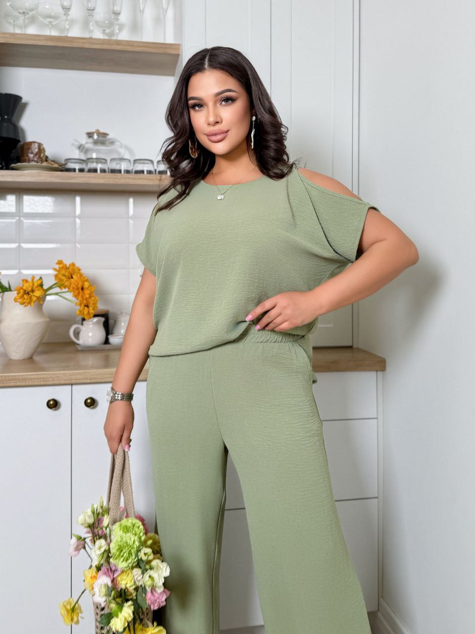 Дуже зручний,легкий, сучасний,як на урочисті події, так і для повсякденного образу . Кофта вільного крою зі спущеним плечем,цікавого крою,брюки на резинці,по бокам кишені,вільні.