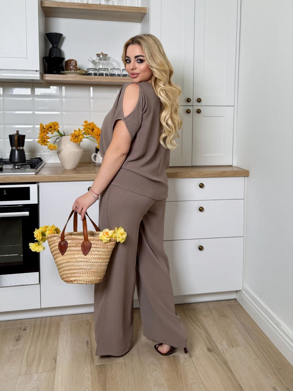 Дуже зручний,легкий, сучасний,як на урочисті події, так і для повсякденного образу . Кофта вільного крою зі спущеним плечем,цікавого крою,брюки на резинці,по бокам кишені,вільні.