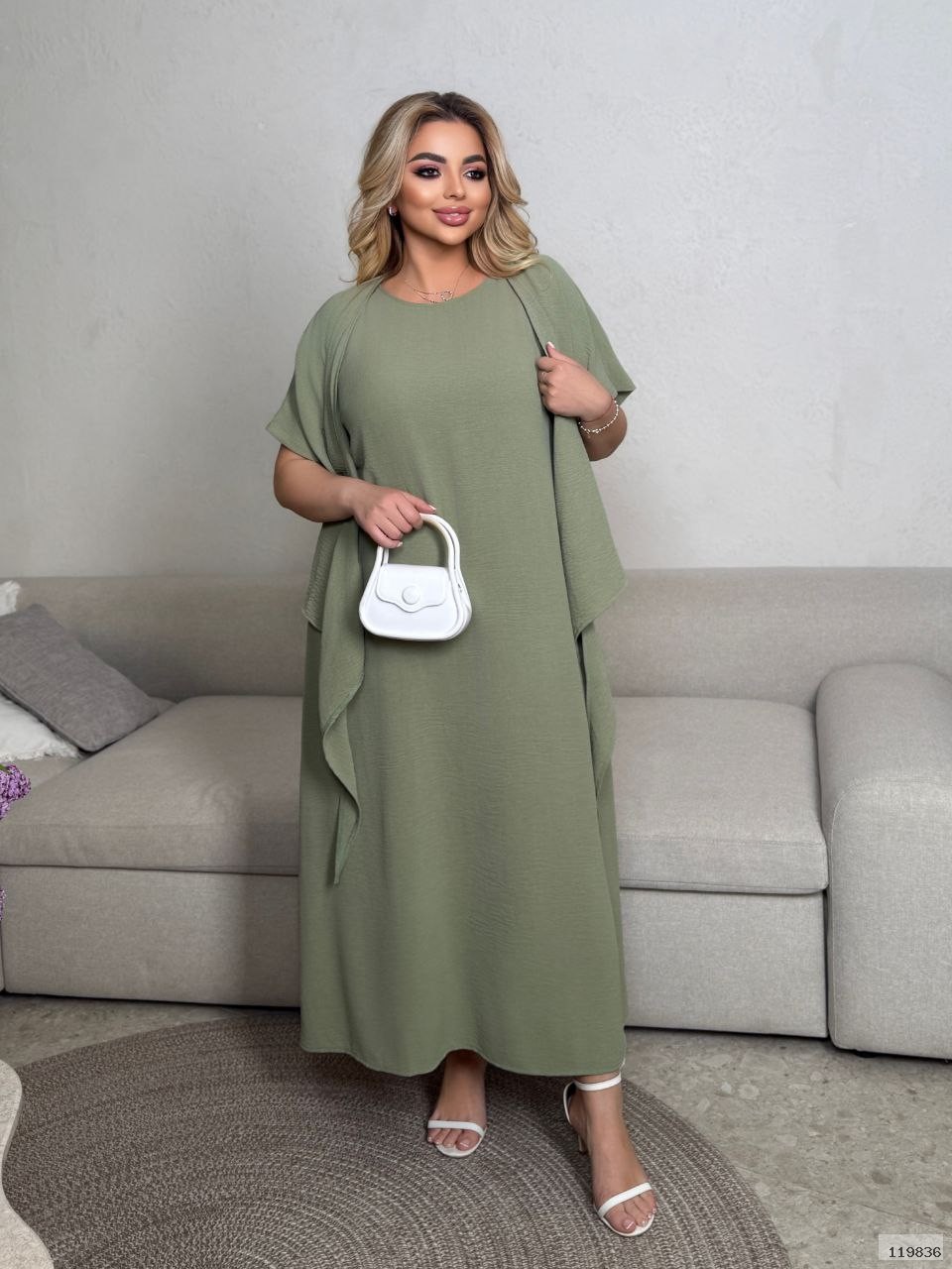 Костюм складається із двох речей: сукня трапецевідного крою з триманим вирізом на груді та з накидки,яка дає можливість робити різні образи,її можно носити разом або окремо.