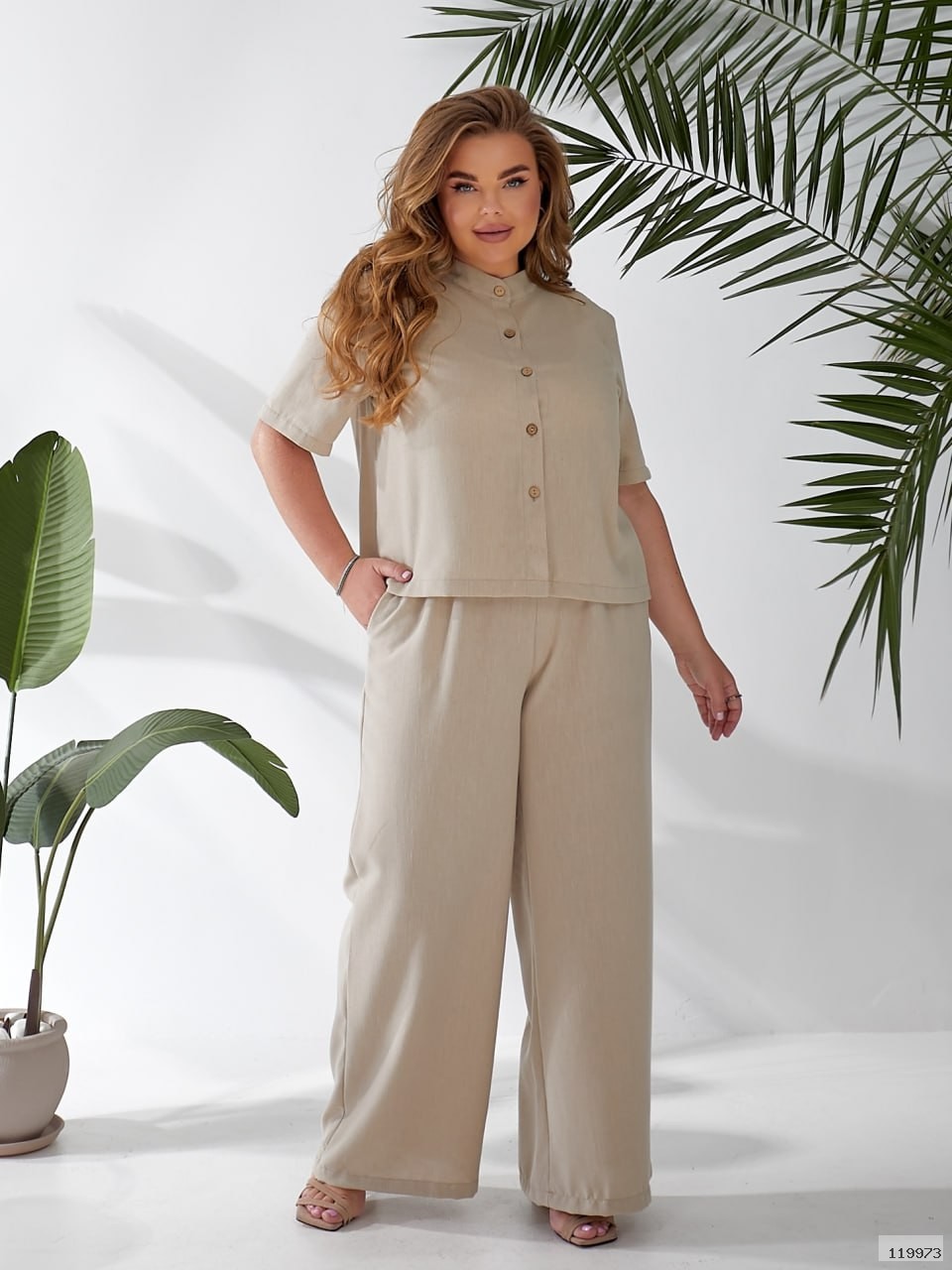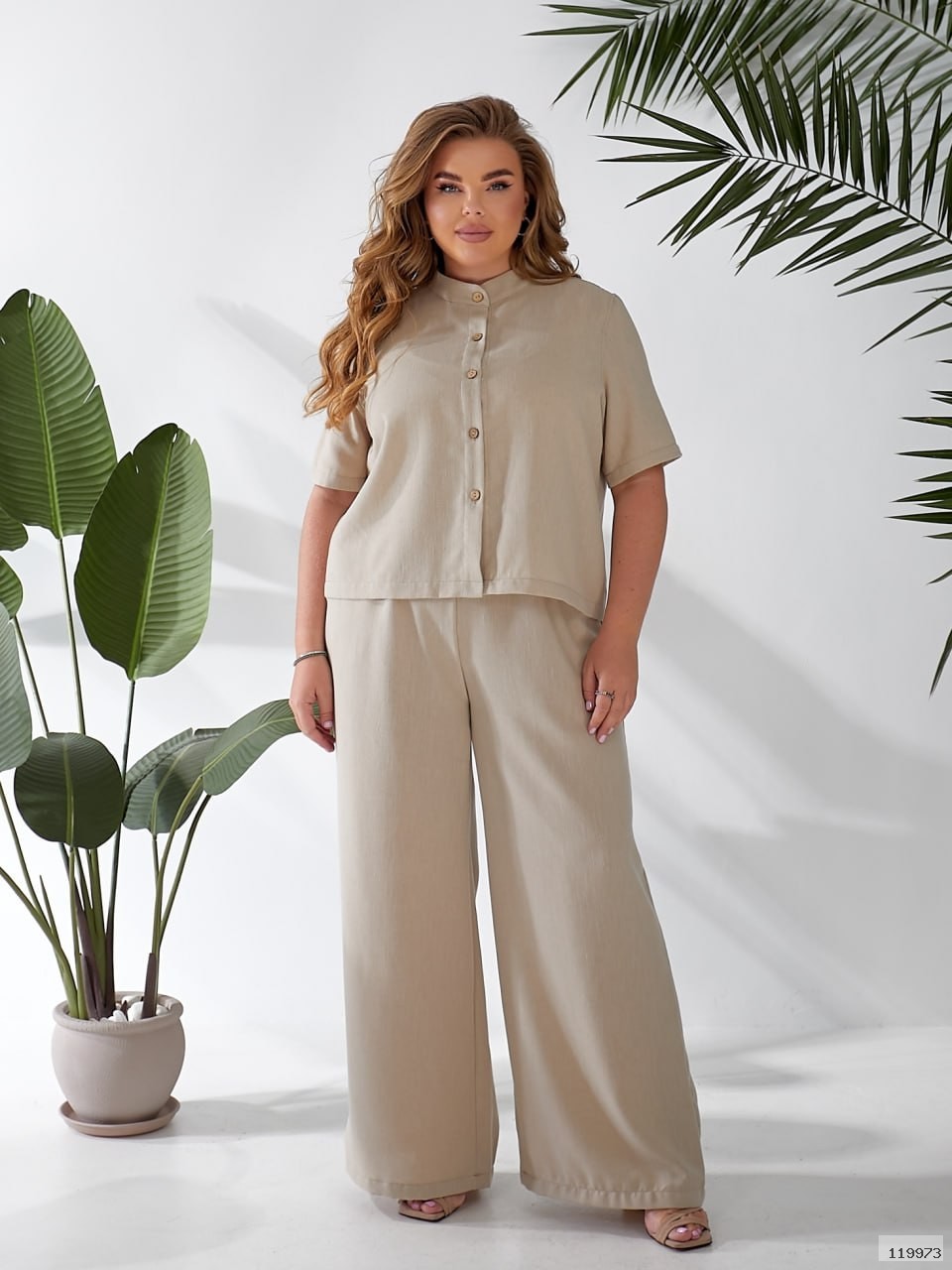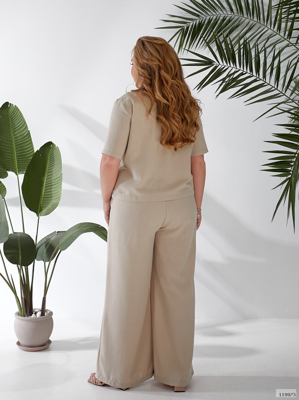 Стильний комплект з натуральної тканини, який поєднує комфорт і сучасний дизайн. Верх — вільна сорочка з коротким рукавом, застібається на гудзики, з комірцем-стійкою. Низ — широкі штани на резинці, що забезпечують зручність у носінні та не сковують рухів.