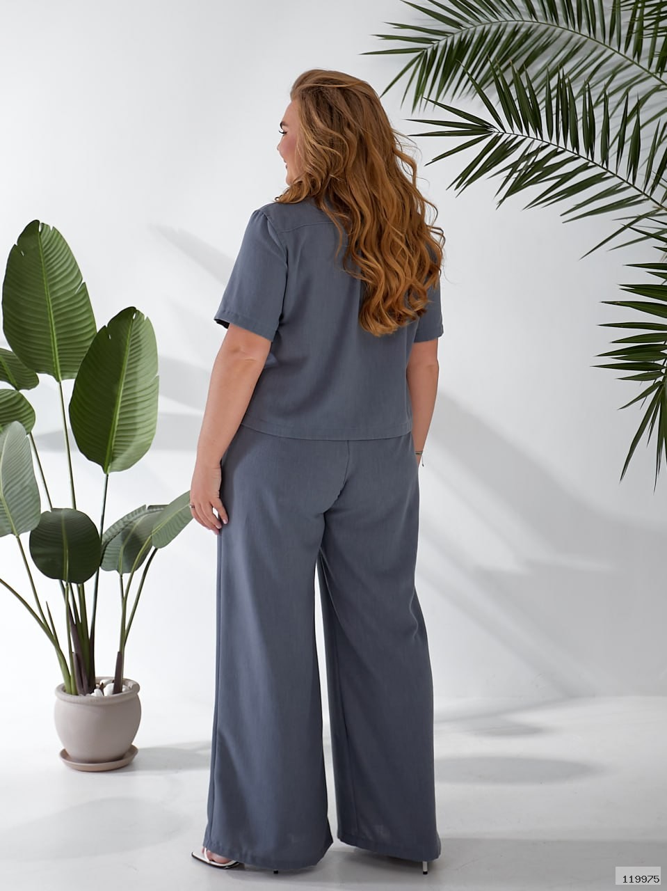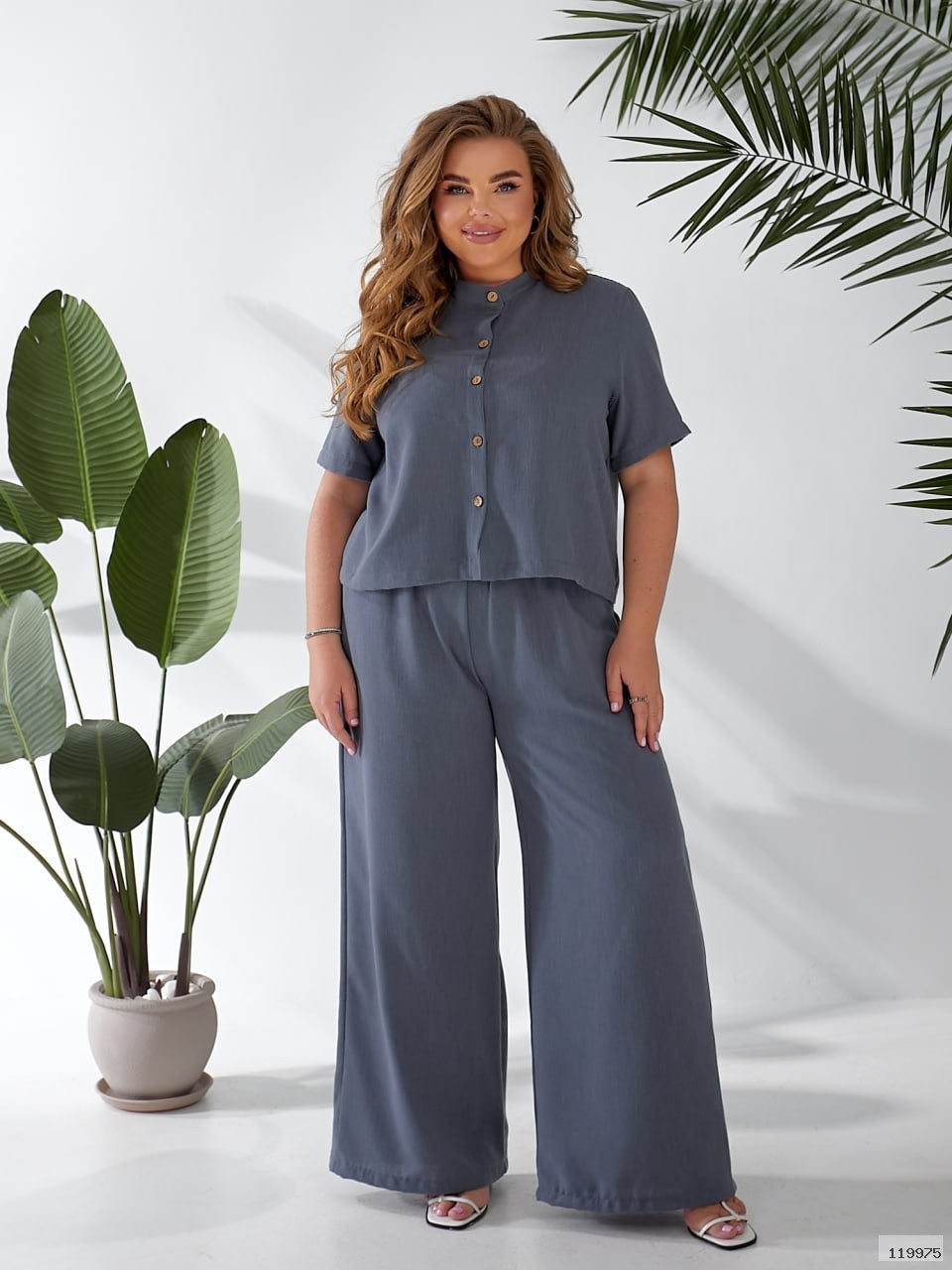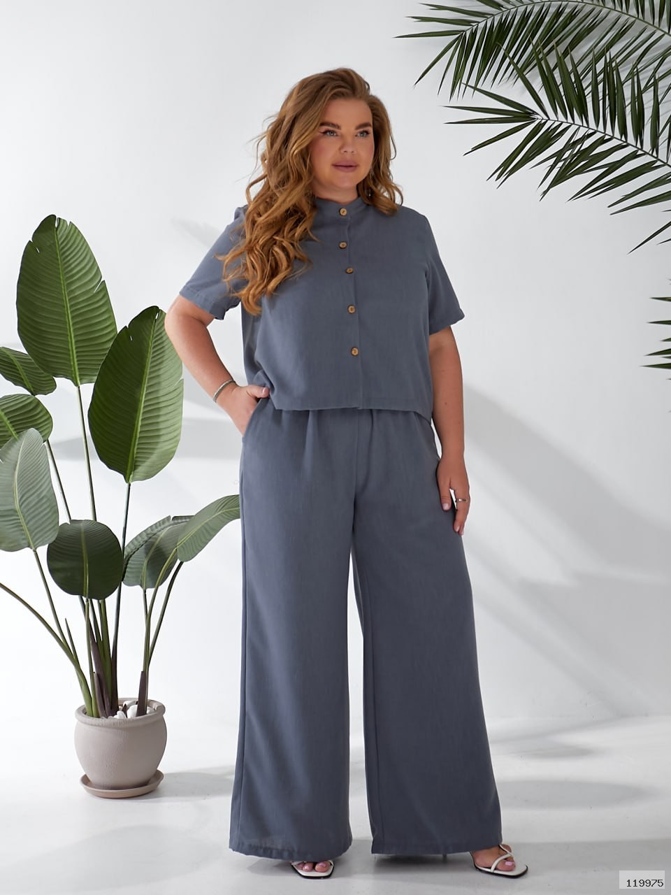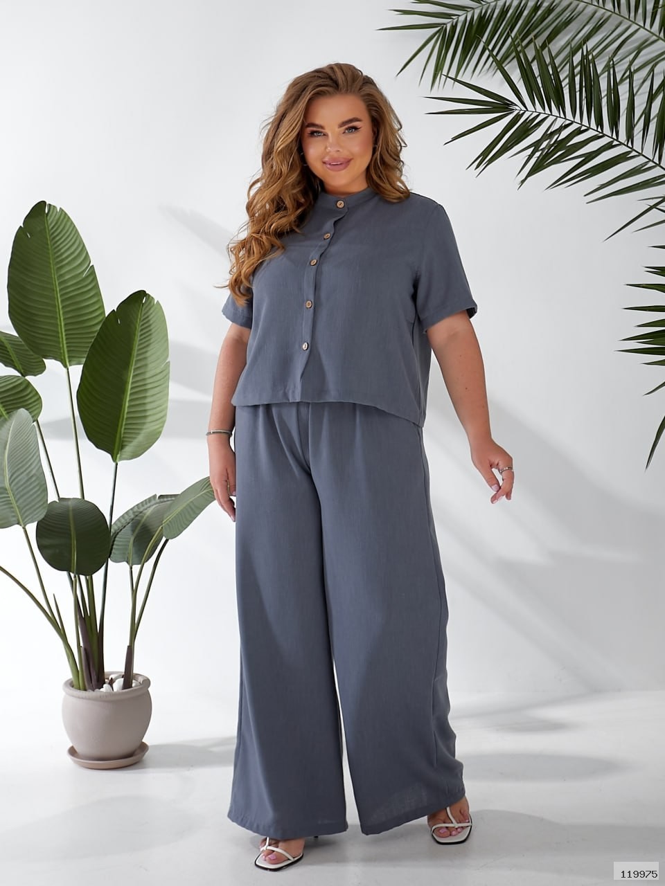Стильний комплект з натуральної тканини, який поєднує комфорт і сучасний дизайн. Верх — вільна сорочка з коротким рукавом, застібається на гудзики, з комірцем-стійкою. Низ — широкі штани на резинці, що забезпечують зручність у носінні та не сковують рухів.