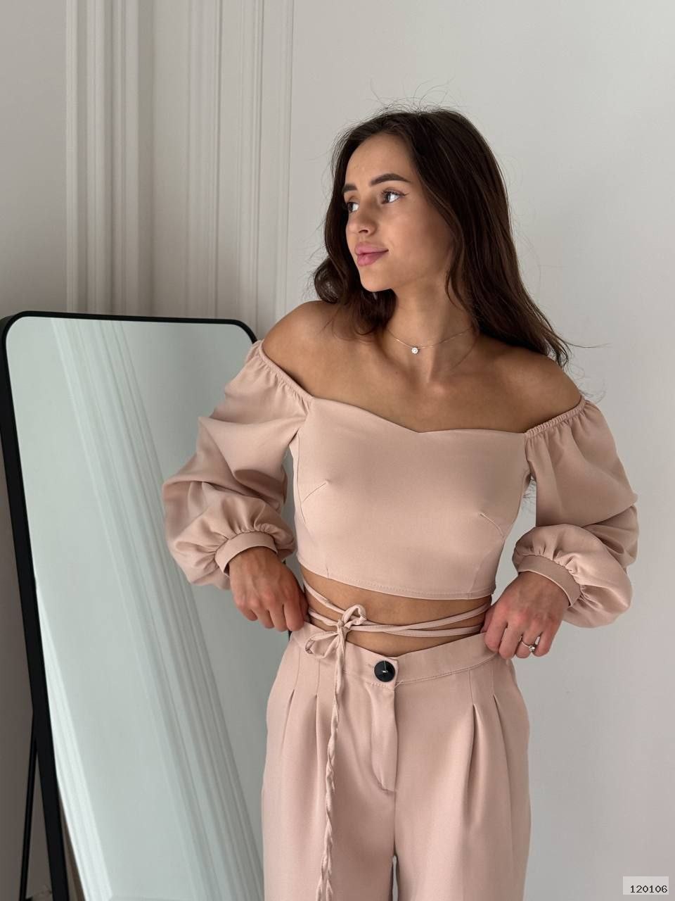 Топ збоку застібається на приховану змійку, на рукавах зверху є резиночка, що дозволяє носити рукав як на плечі, так і спускати нижче