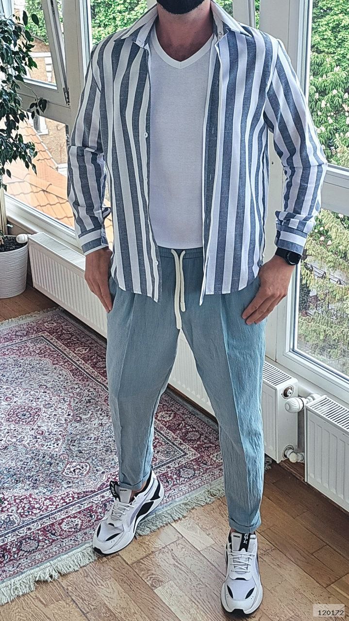 Комфортна сорочка класичного крою з коміром-стійкою та довгими рукавами з манжетами на ґудзиках. Штани на резинці зі шнурком і бічними кишенями-зручні та легкі.
