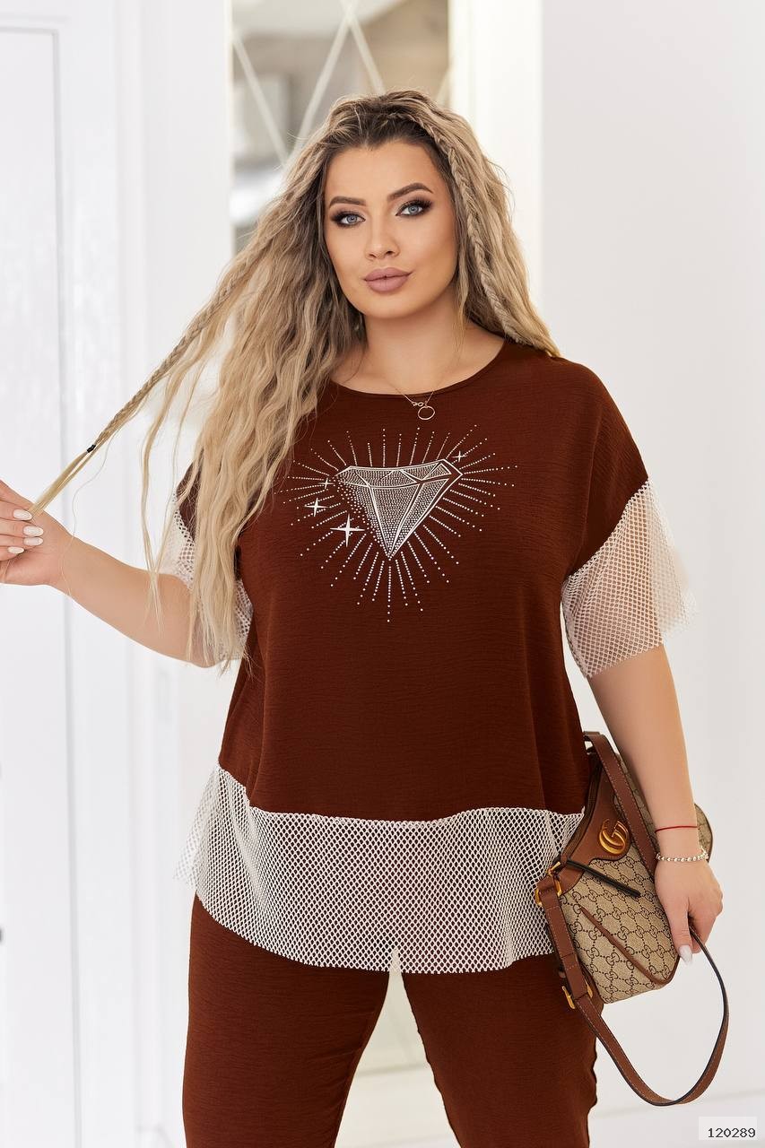 Блуза вільного крою зі спущеним плечем, прикрашена трендовим принтом з камінчиками і декорована на рукавах і по низу декоративною сіткою. Брюки вільного крою, фасон- бананчики , до низу звужені, в талії пояс на круговій гумці, з карманами.