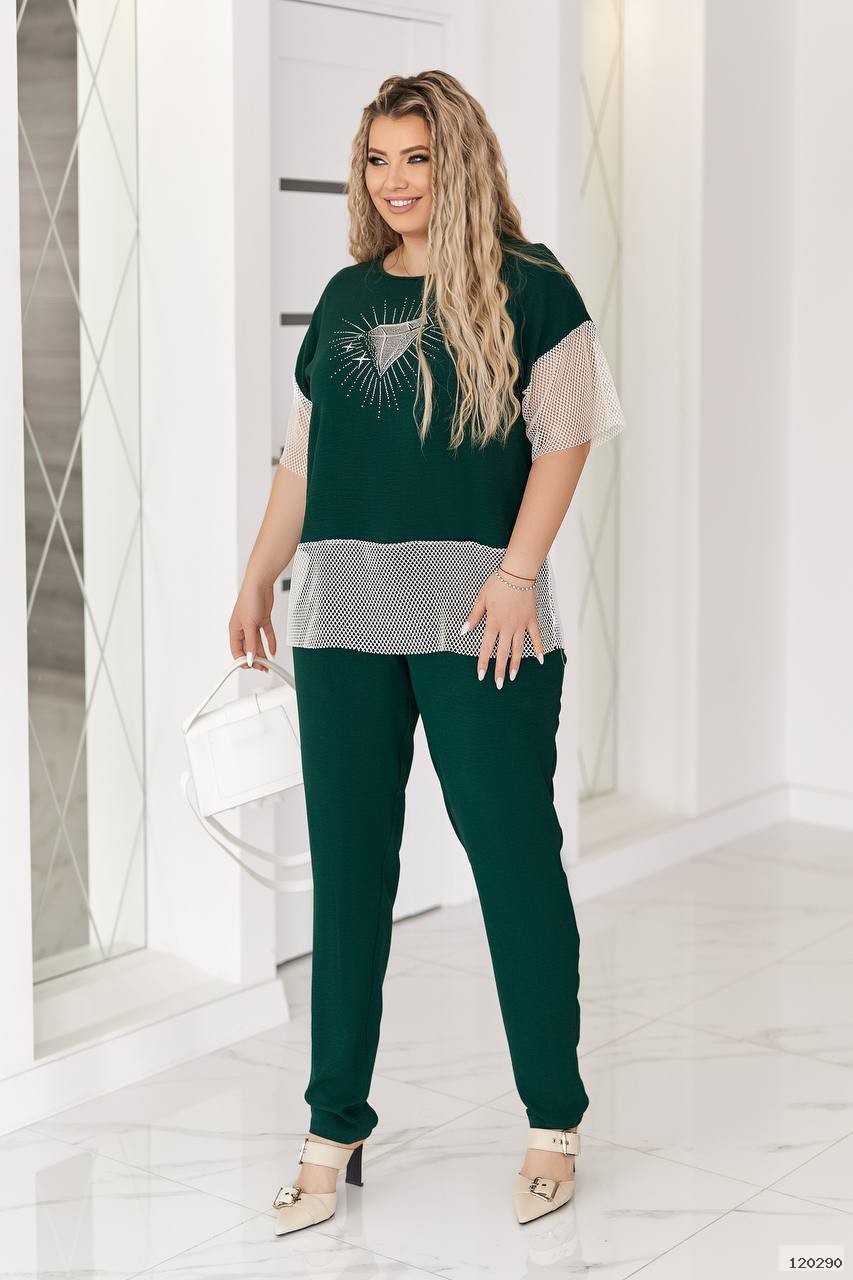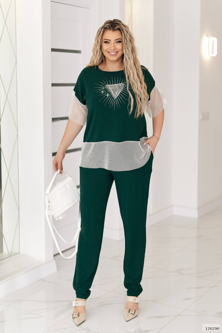 Блуза вільного крою зі спущеним плечем, прикрашена трендовим принтом з камінчиками і декорована на рукавах і по низу декоративною сіткою. Брюки вільного крою, фасон- бананчики , до низу звужені, в талії пояс на круговій гумці, з карманами.