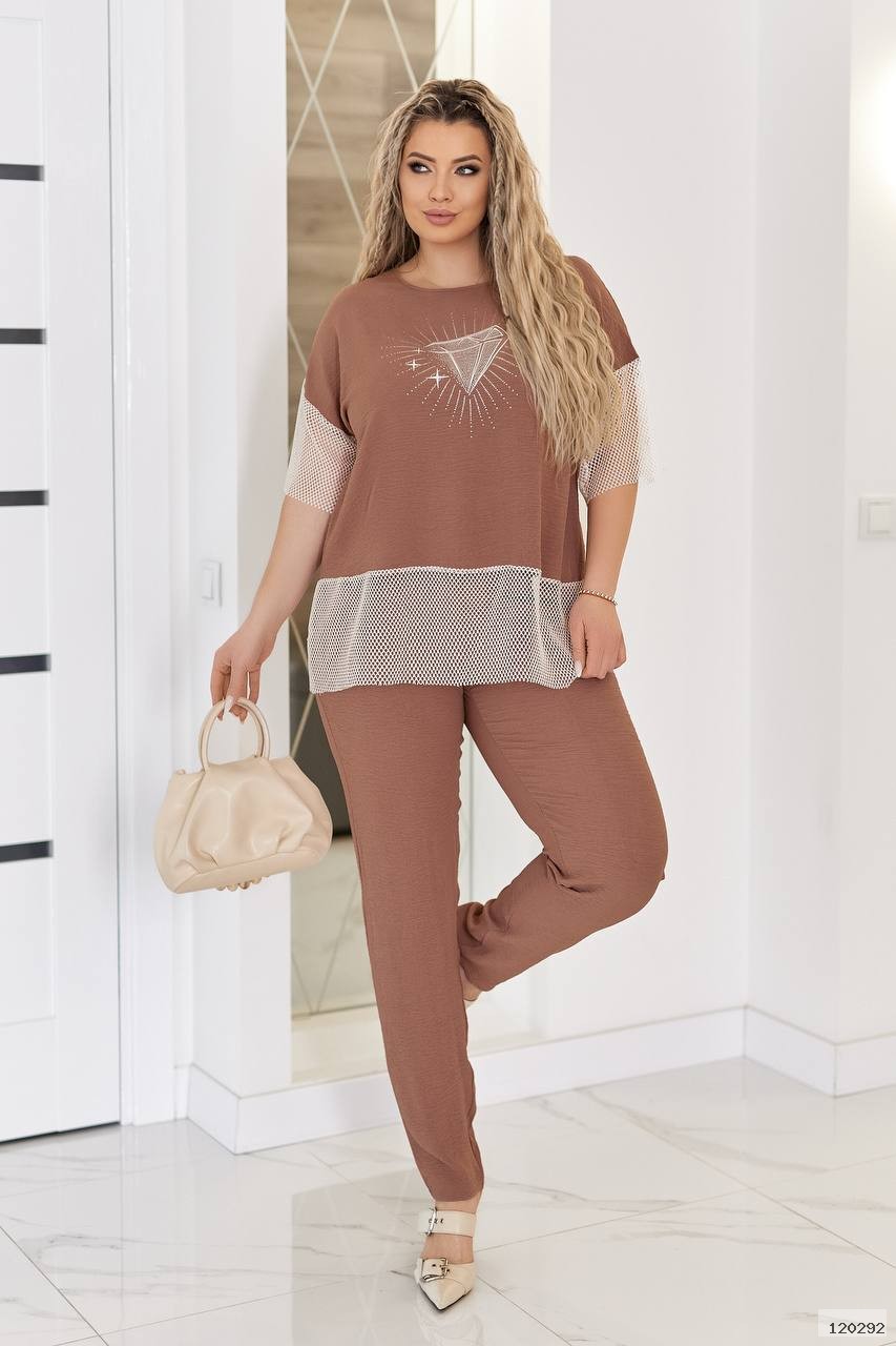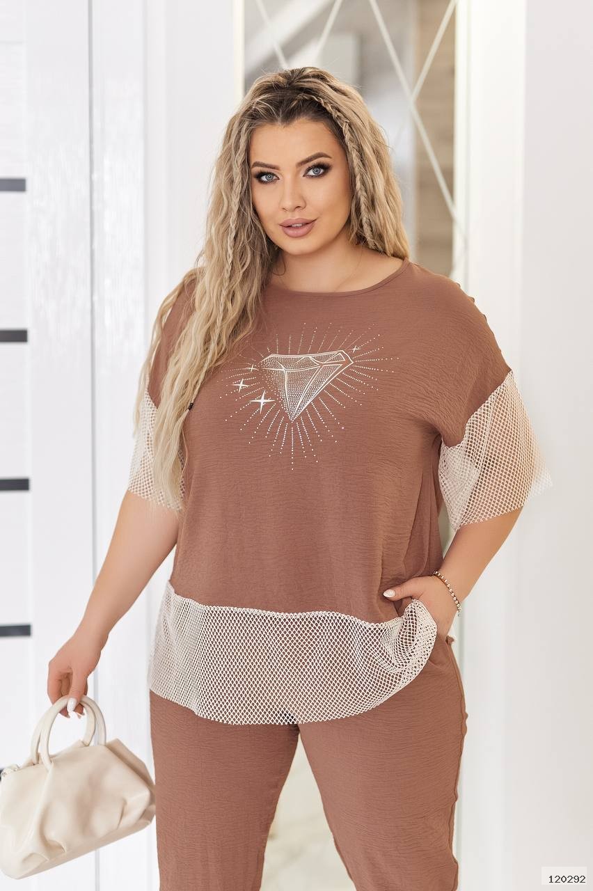 Блуза вільного крою зі спущеним плечем, прикрашена трендовим принтом з камінчиками і декорована на рукавах і по низу декоративною сіткою. Брюки вільного крою, фасон- бананчики , до низу звужені, в талії пояс на круговій гумці, з карманами.