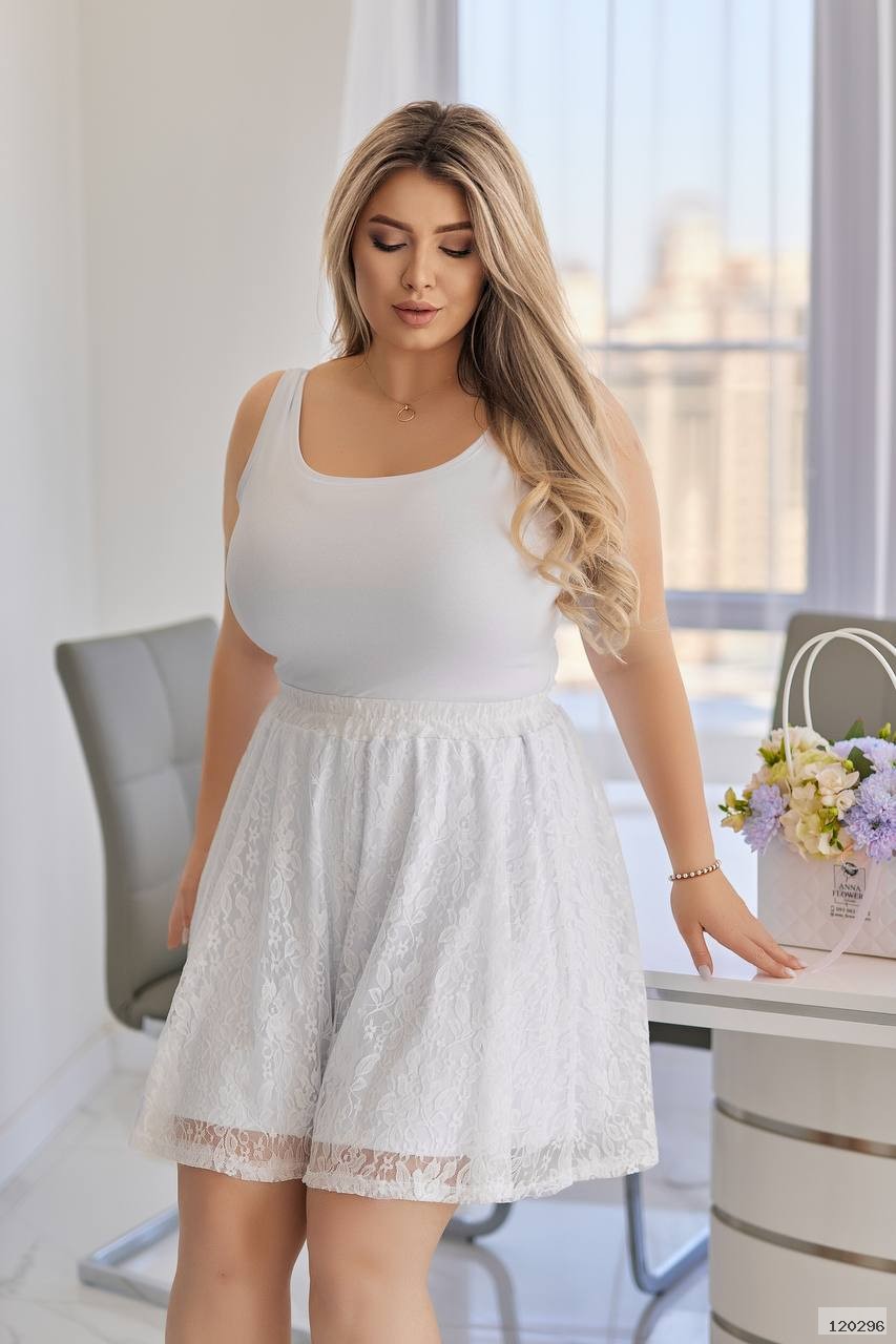 Футболка гіпюрова + майка з мікро дайвінгу + спідниця- шорти гіпюрова , пришиті знизу шорти з мікро дайвінгу.