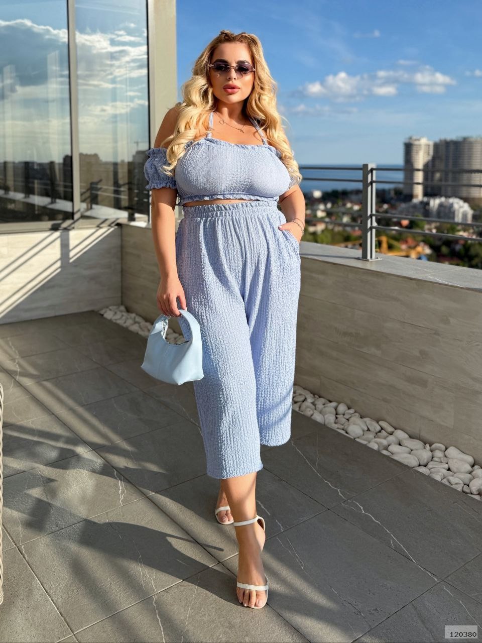 Літній костюм. Кофта+подовжені шорти. Кофта вільного крою на гумці вгорі та внизу, рукав - ліхтарик. Шорти на резинці із кишенями.