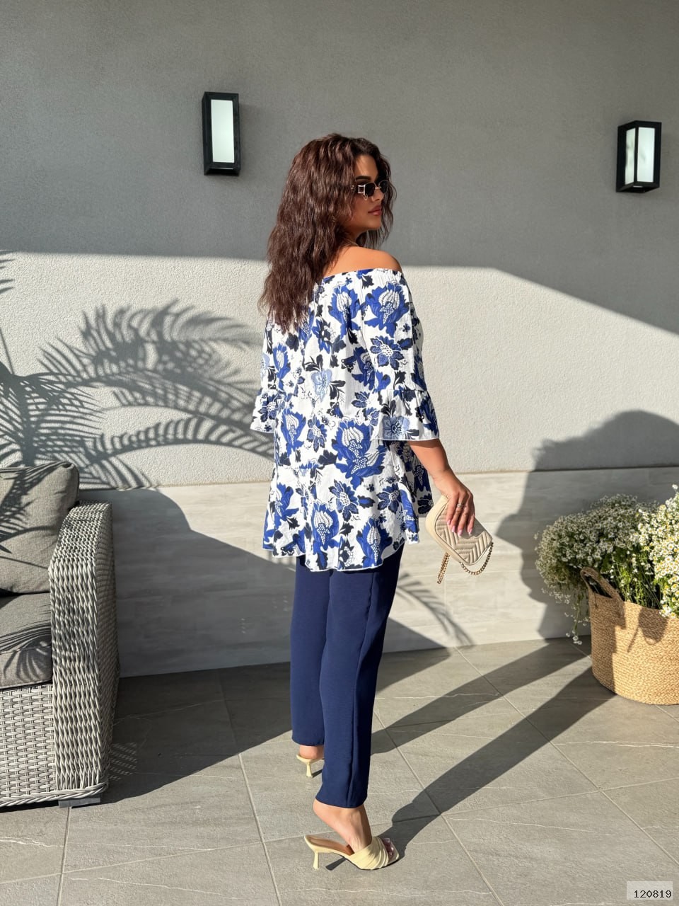 Стильний комплект брюки, складається з блузки і штанів. Рукав зі спущеною лінією плеча, по окату зі складанням. Ідеальна річ у гардеробі жінки, яка вважає класику пріоритетним стилем. Дуже красиве поєднання тканини додасть вашому образу кокетливий та романтичний образ!
