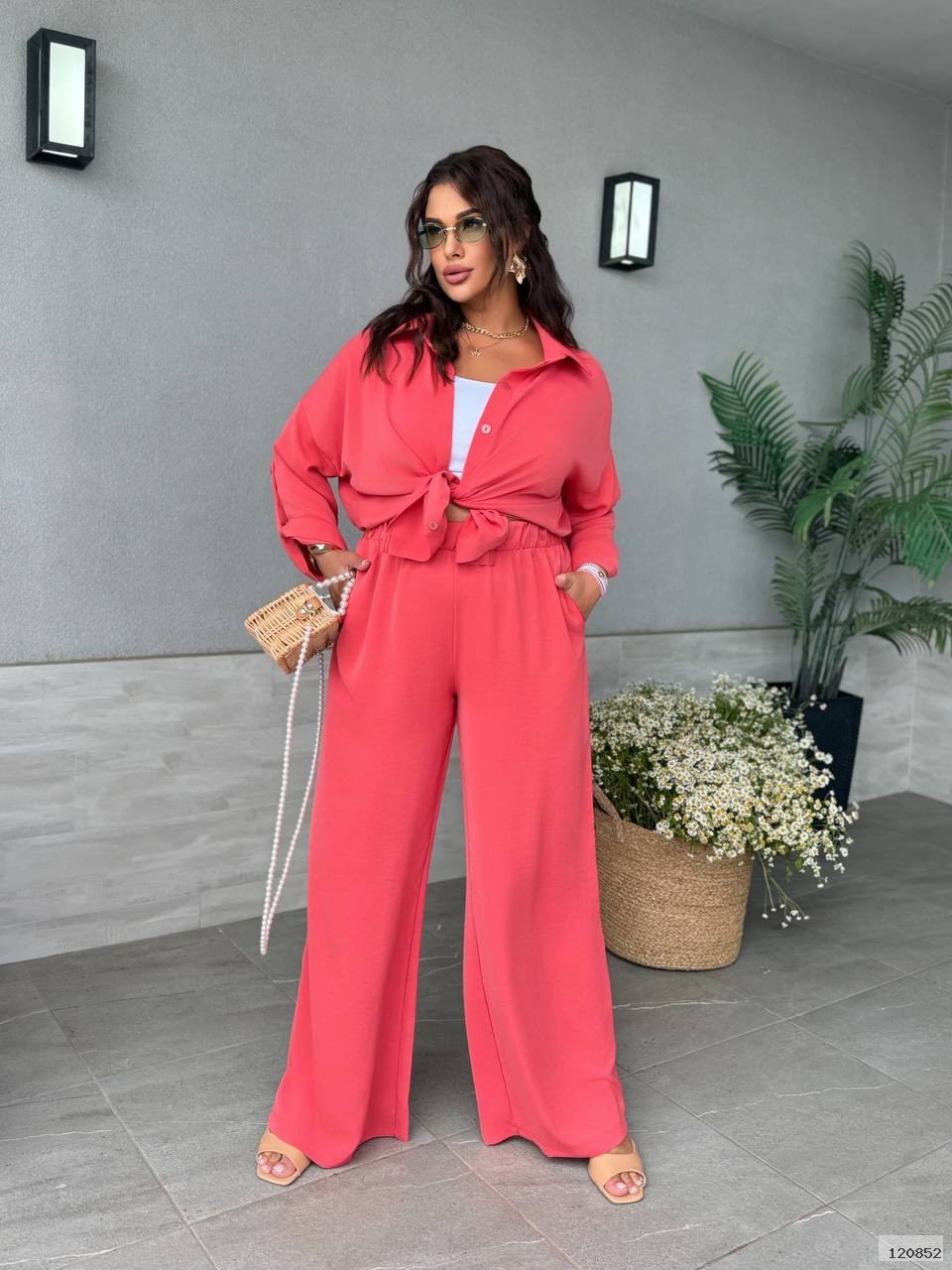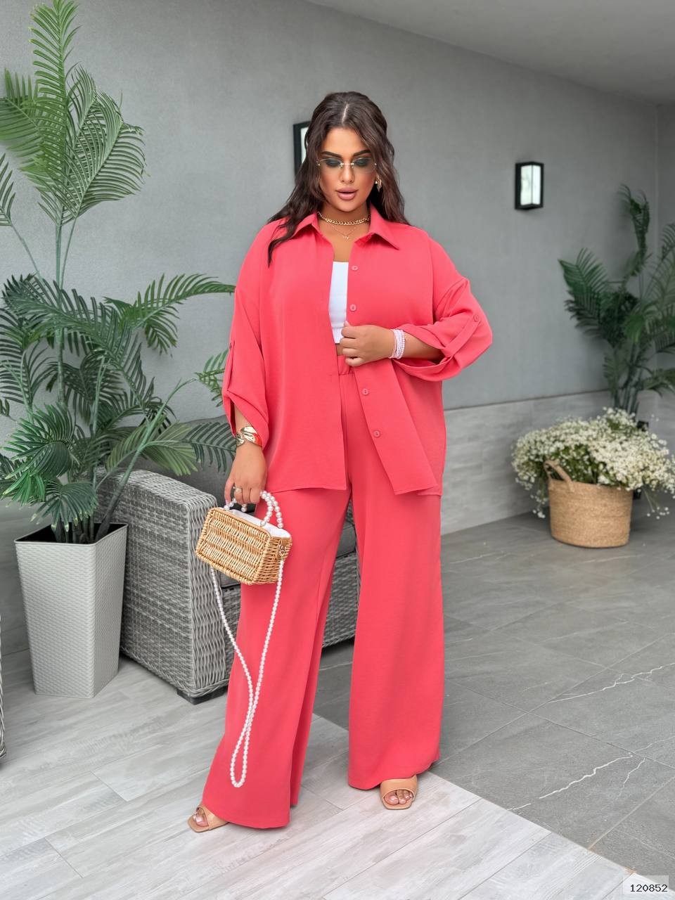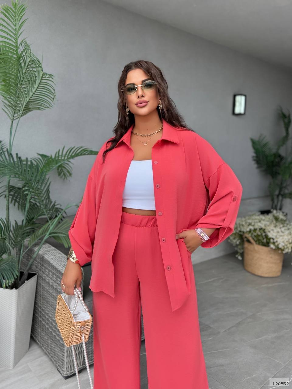 Сорочка на ґудзиках,з класичним відкладним коміром.Рукав — трансформер.Штани вільного крою, на резинці, з бічними кишенями.