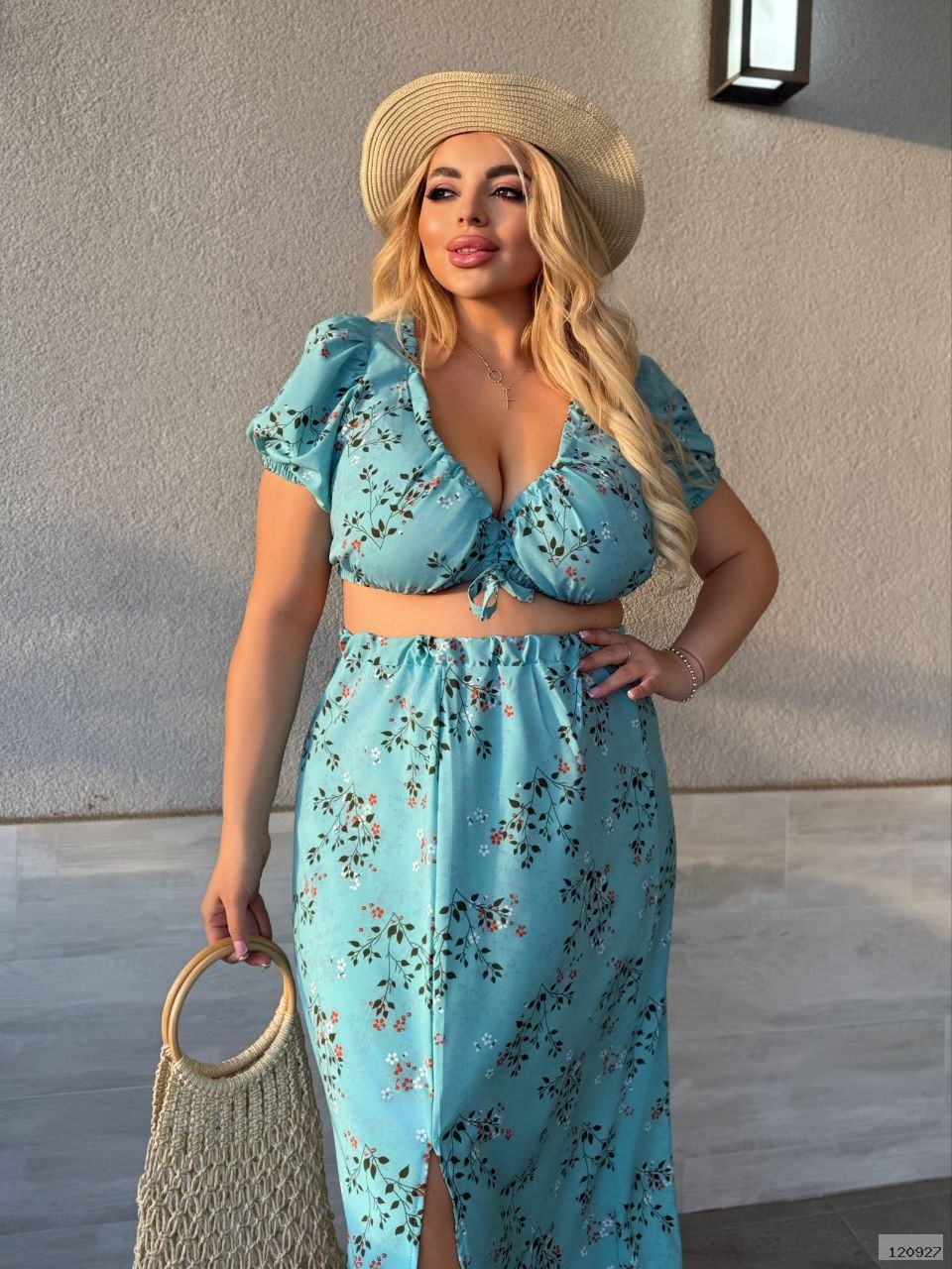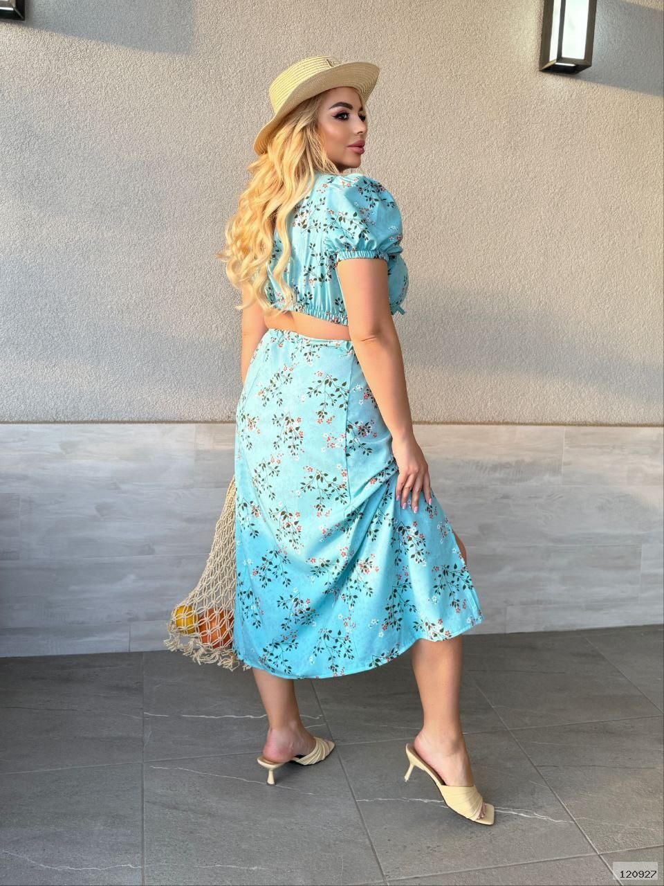 Літній костюм, Спідниця. Кофта з коротким рукавом - ліхтариком, низ кофти прилаштований на резинці, горловина прилаштована шнурком. Спідниця по фігурі з розрізом одну ногу, на поясі гумка.