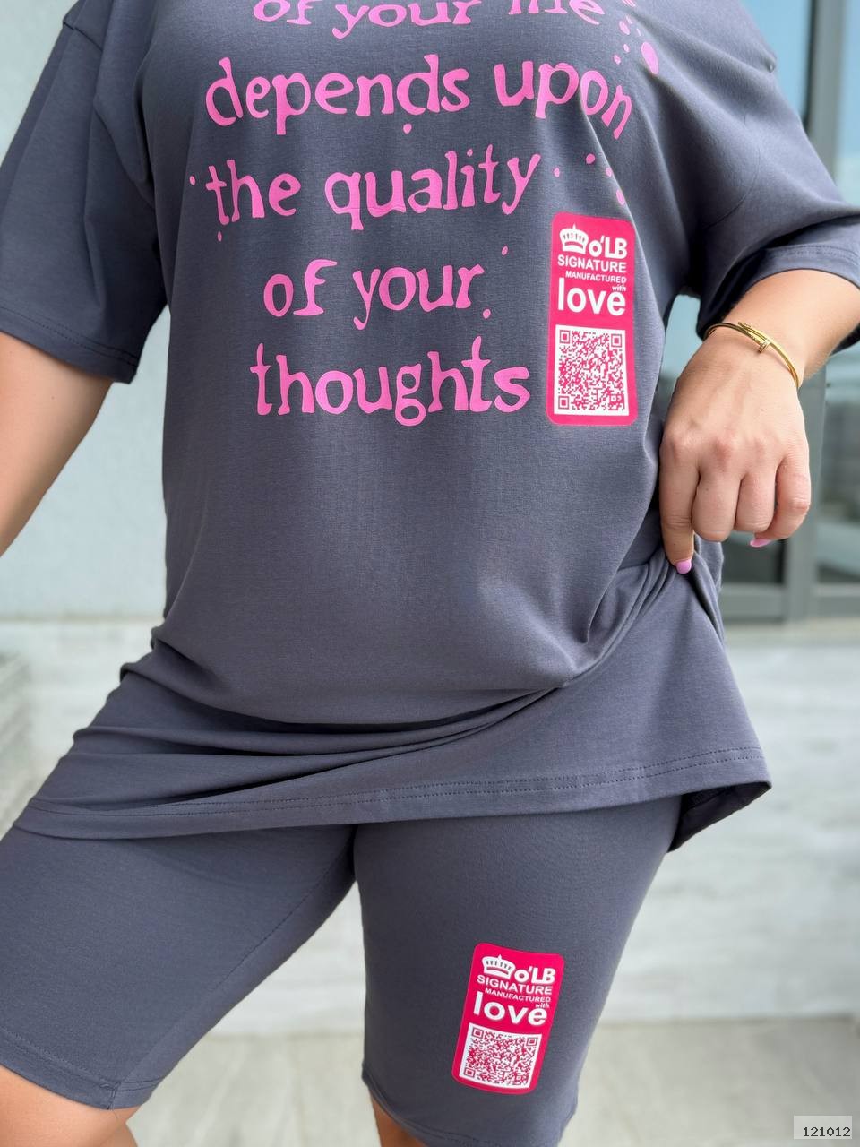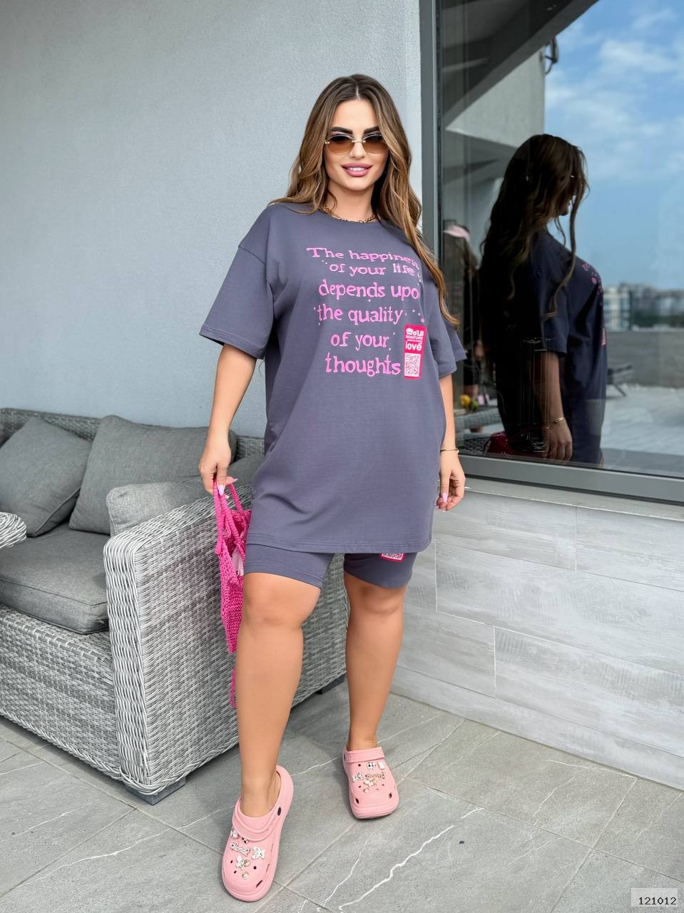 Стильний костюм двійка.Футболка оверсайз та велосипедки з якісним накатом.Висока посадка веліків робить їх мега зручними.Футболка вільного крою дуже зручна та комфортна.