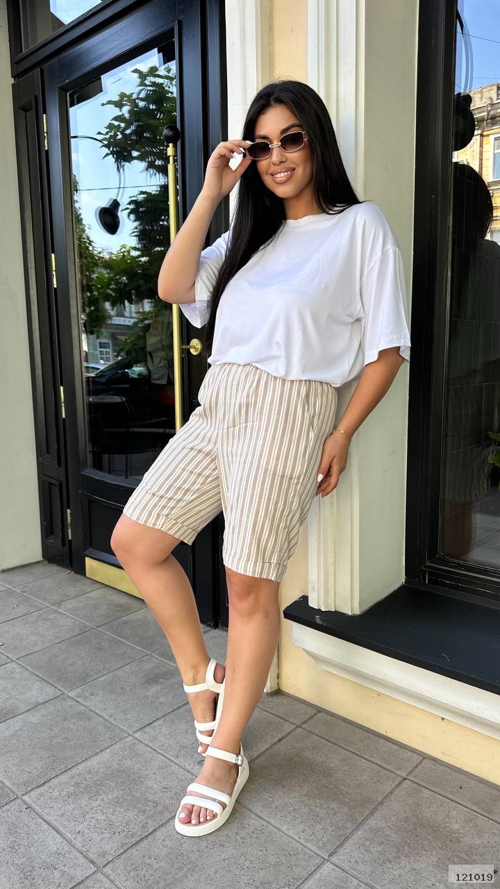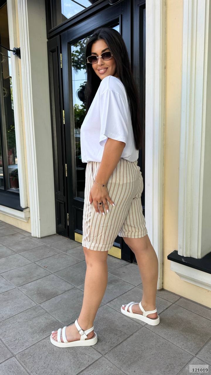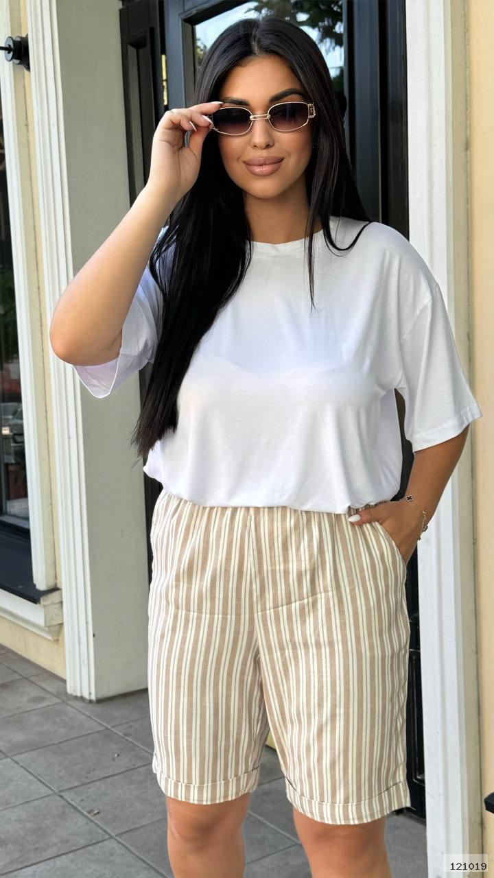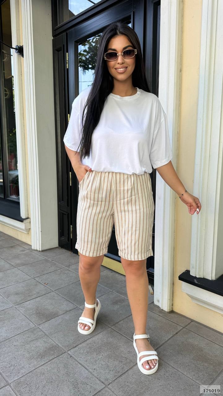 Комфортний прогулянковий костюм шорти та футболка. Шорти мають дві кишені та оздоблені манжетом, пояс на резинцi та регулюється завʼязкою( на фото не видно)