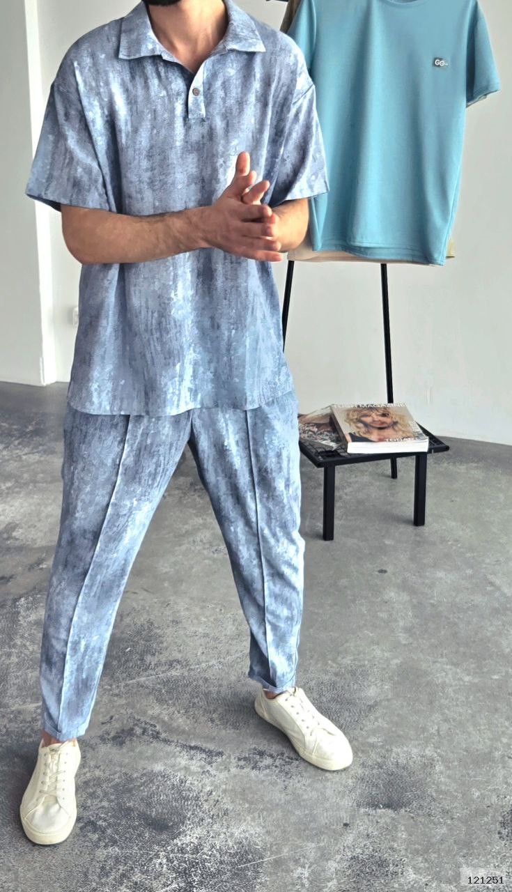 Футболка з коротким рукавом,коміром-поло та гудзиком,штани на резинці з бічними кишенями.