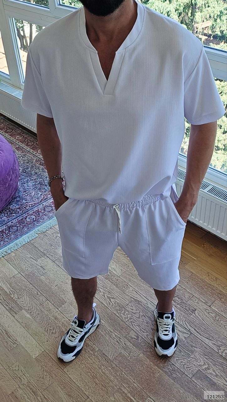 Сорочка вільного крою з V-подібним вирізом та шорти на резинці зі шнурком і кишенями