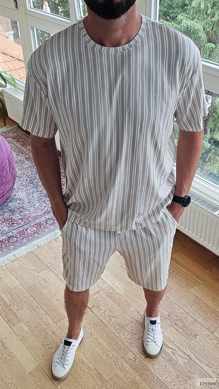Футболка вільного крою з округлим вирізом + шорти на резинці зі шнурком і боковими кишенями.