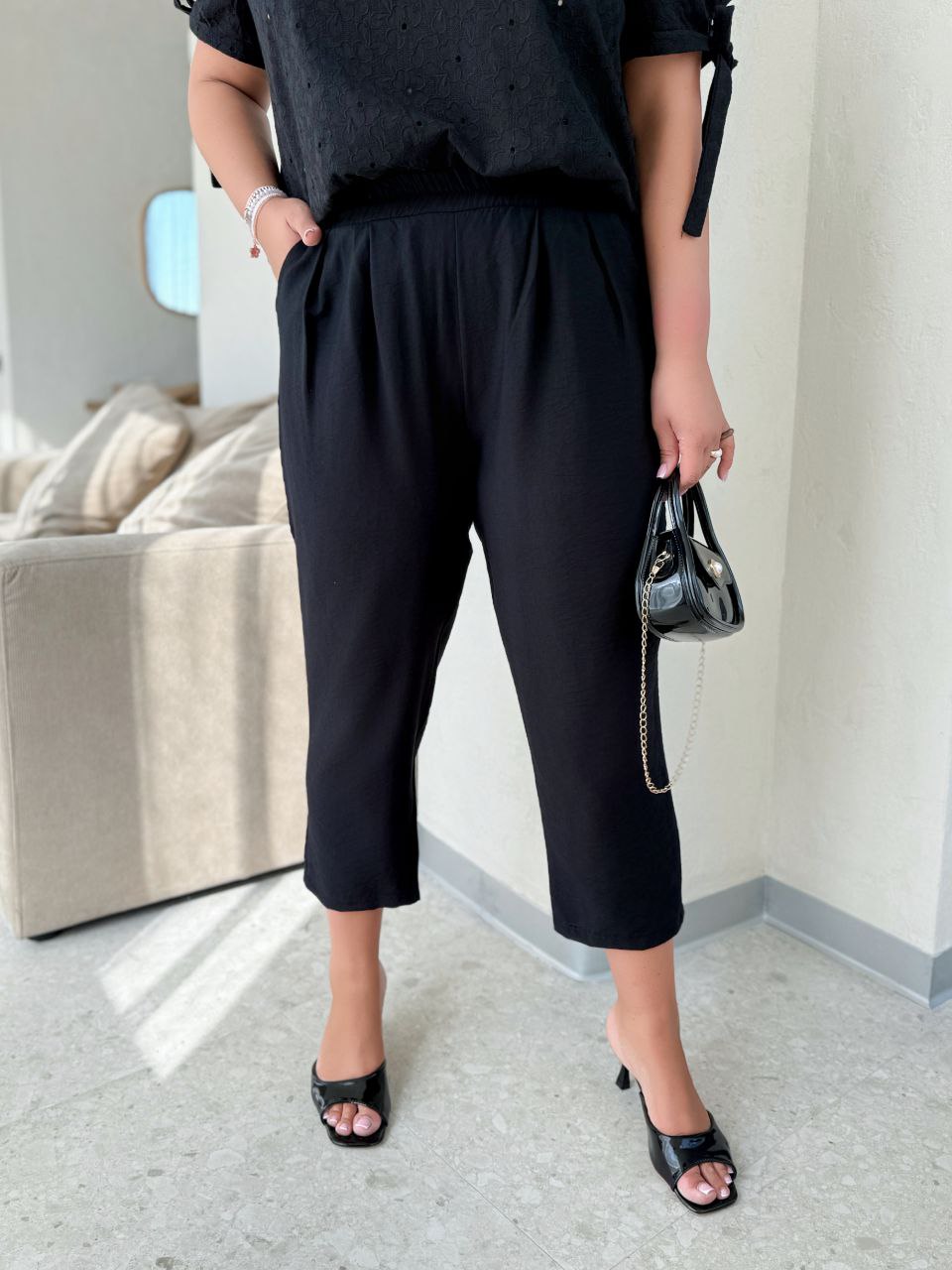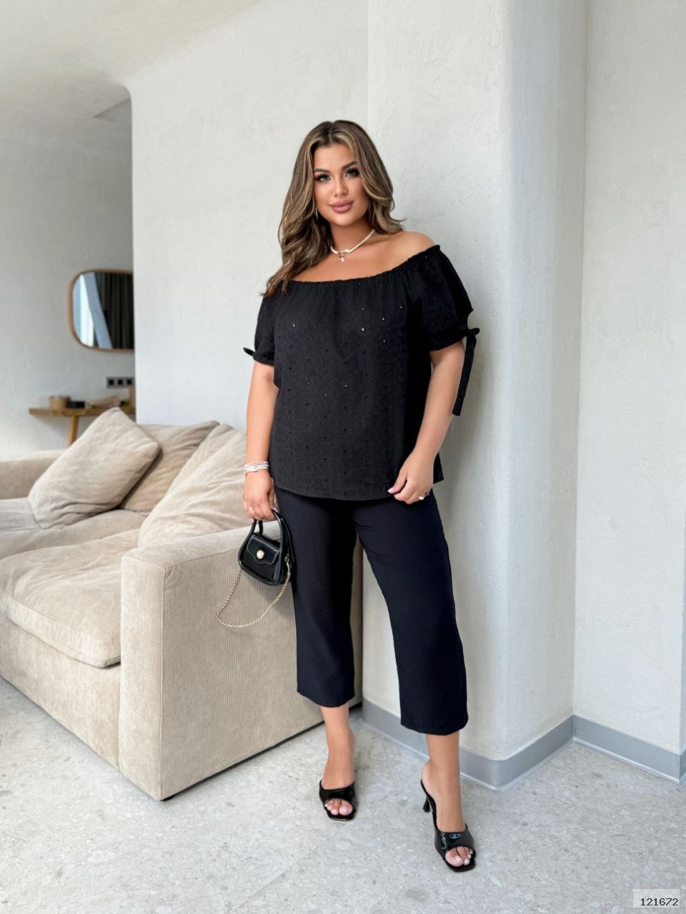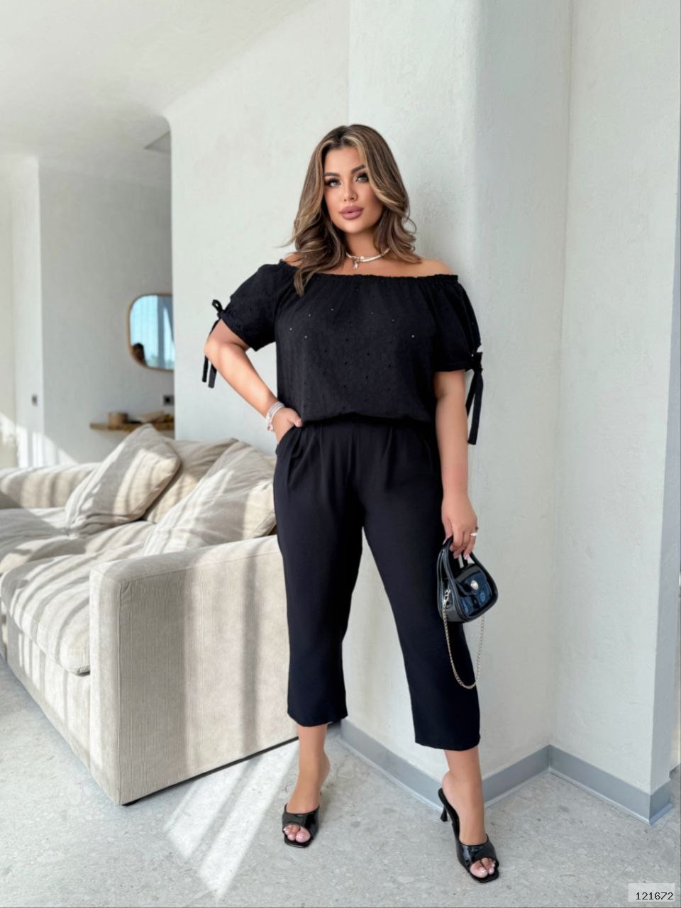 з натуральної тканини прошва.На плечах резинка,завдяки якою є можливість відкрити плечи,рукав на завʼязках.Крій вільний.Брюки вироблено з тканини льон-жатка,на поясі резинка,попереду защіпи.Довжина 7/8.