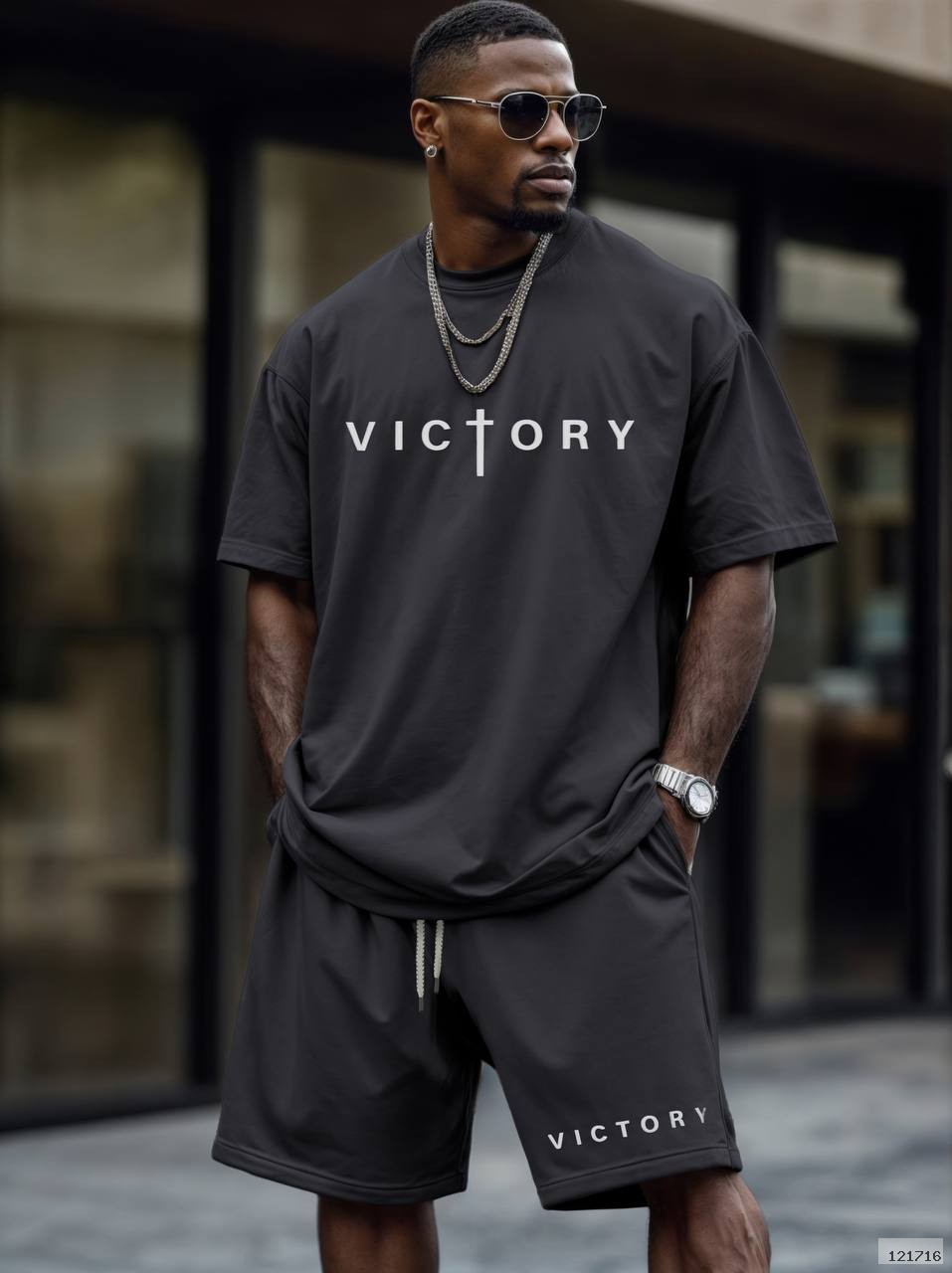 Футболка вільного крою з округлим вирізом + шорти на резинці зі шнурком і боковими кишенями.Доповнені стильною наклейкою «Victory».