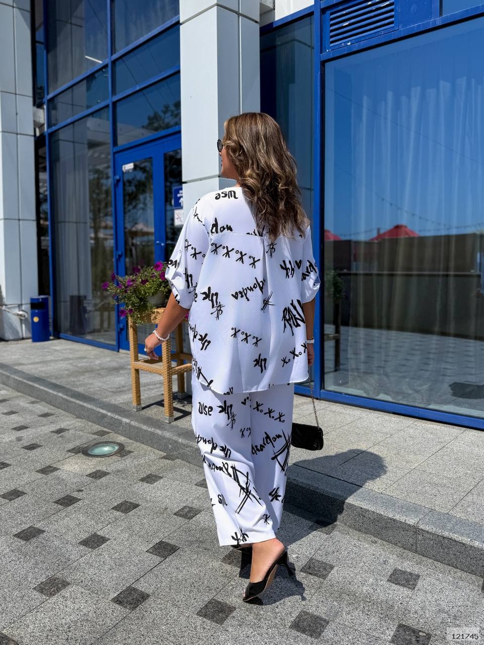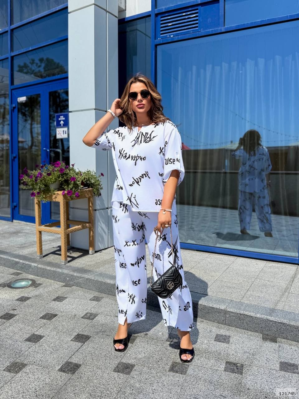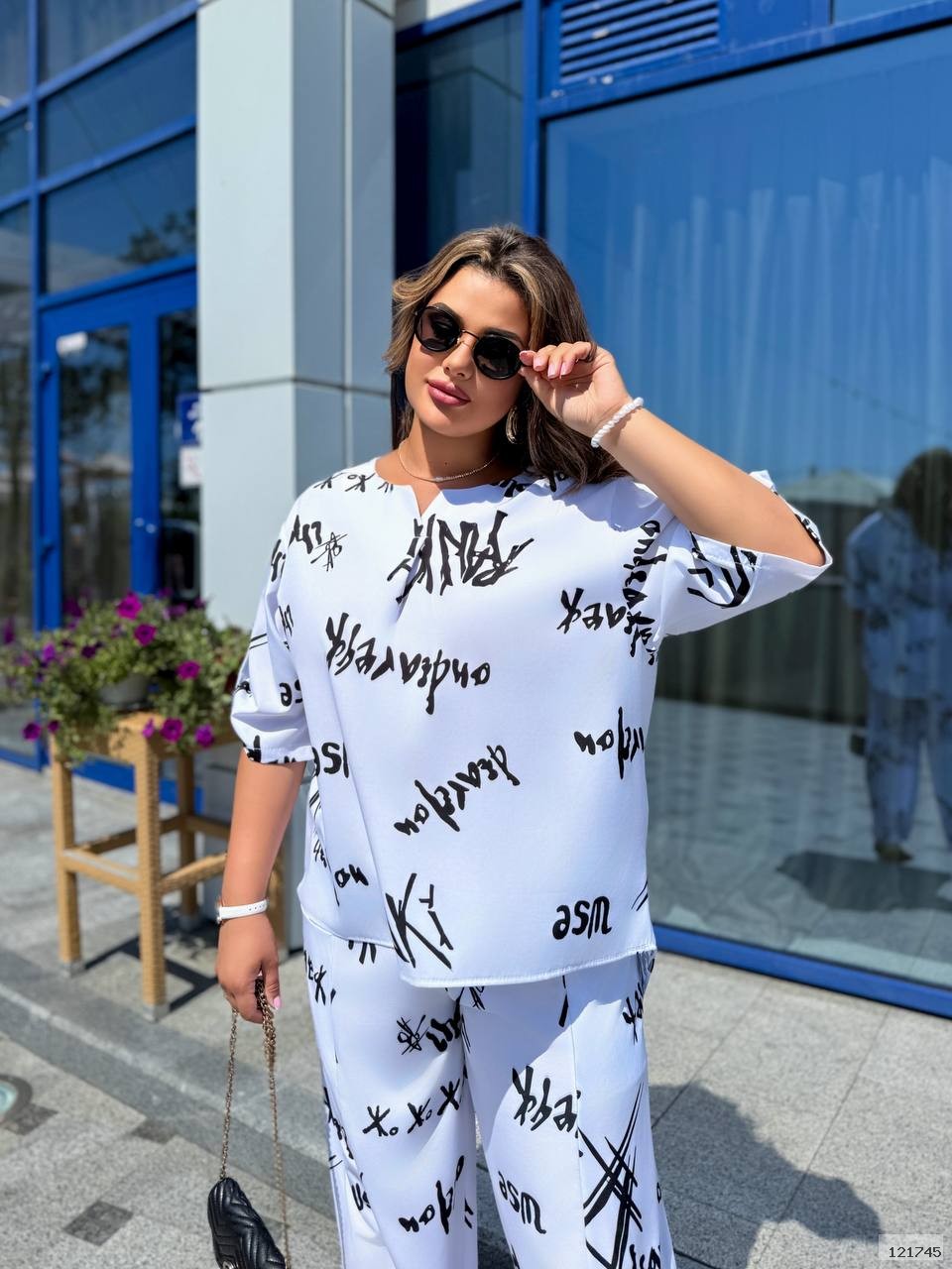Костюм з ненавʼязливим але оригінальним принтом з легкої тканини , який підходить для повсякденних образів і для тих кому важлива легкість та комфорт. На штанях по боках кишені і невеликі розрізи знизу.