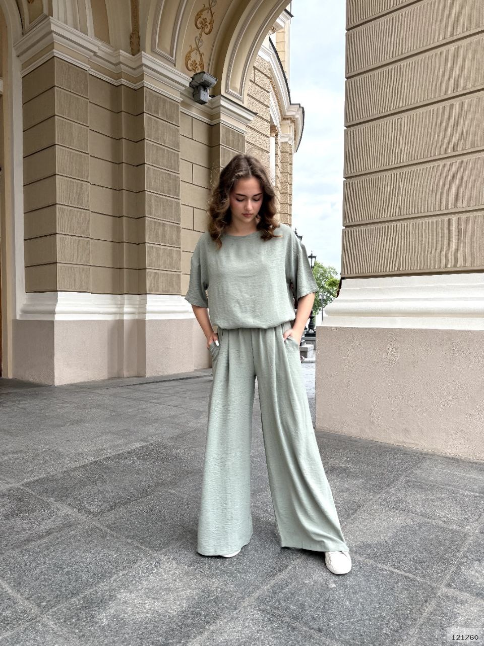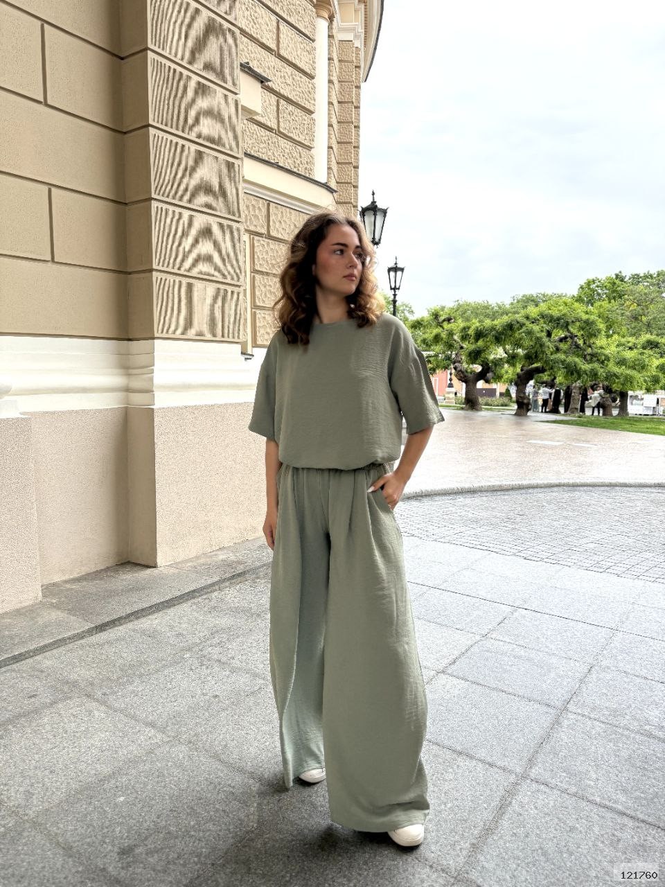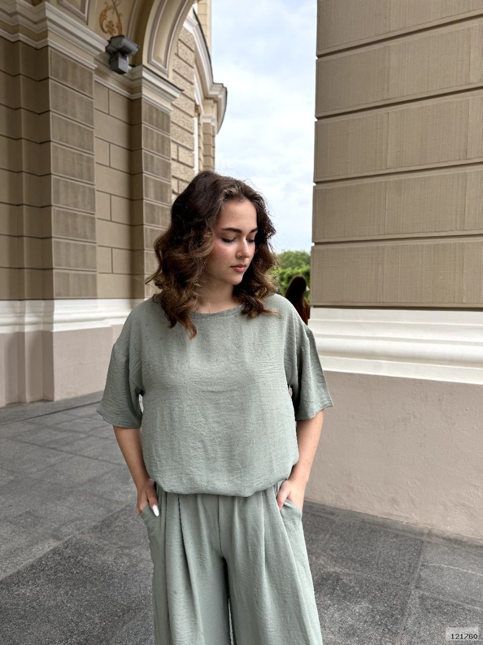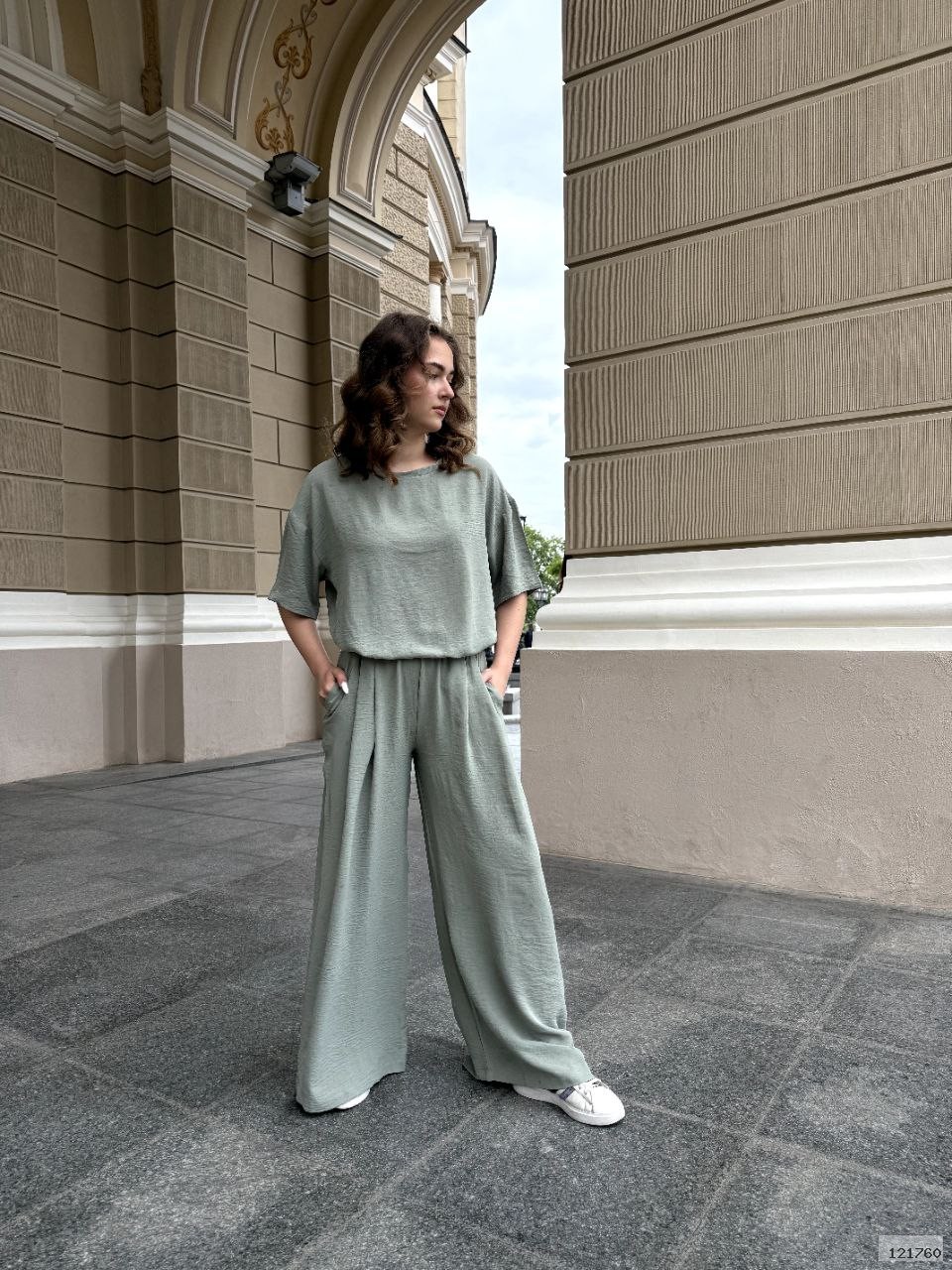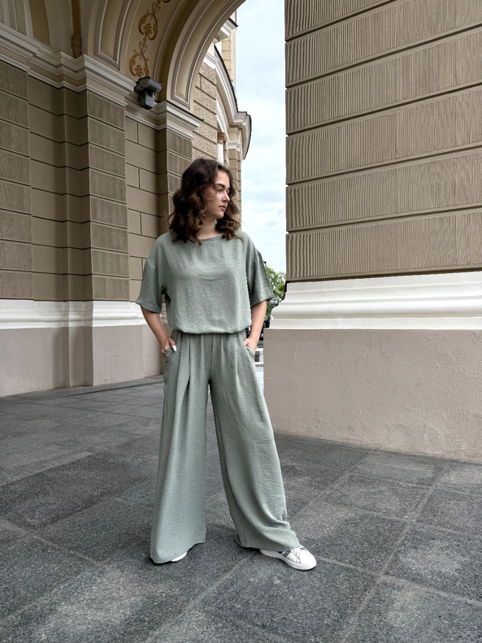 Стильний жіночий костюм, який поєднує комфорт і елегантність. Складається з широких кюлотів і вільної футболки прямого крою. Виконаний із легкої, приємної до тіла тканини — американського крепу, що не мнеться, має м’який матовий блиск і відмінно тримає форму.