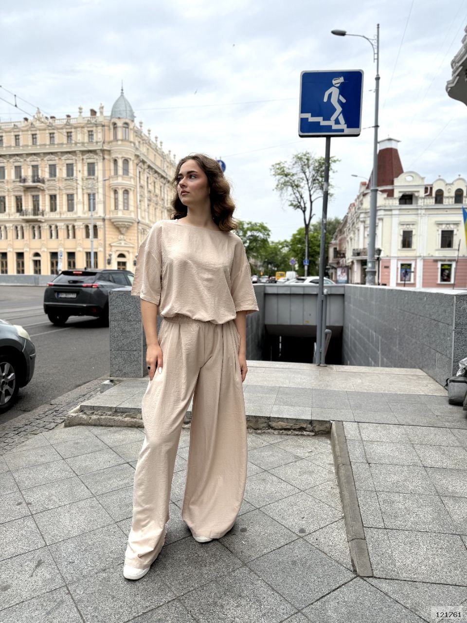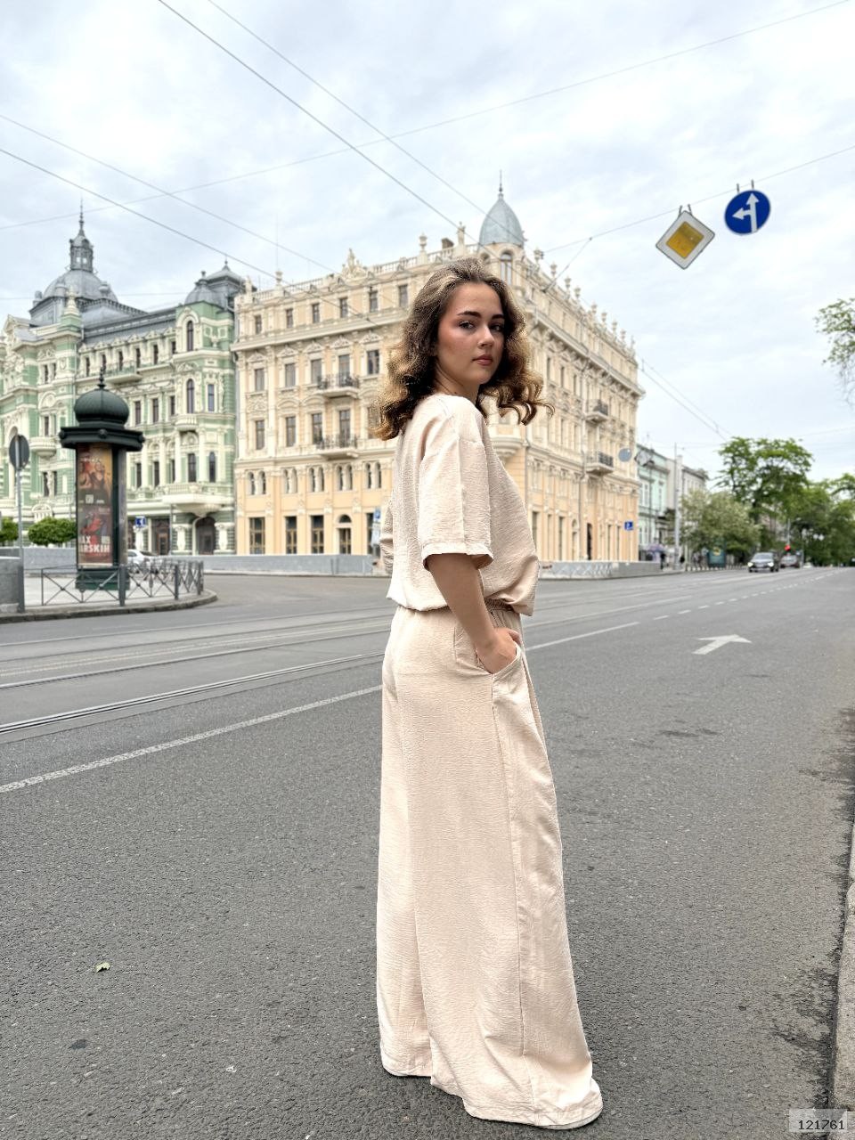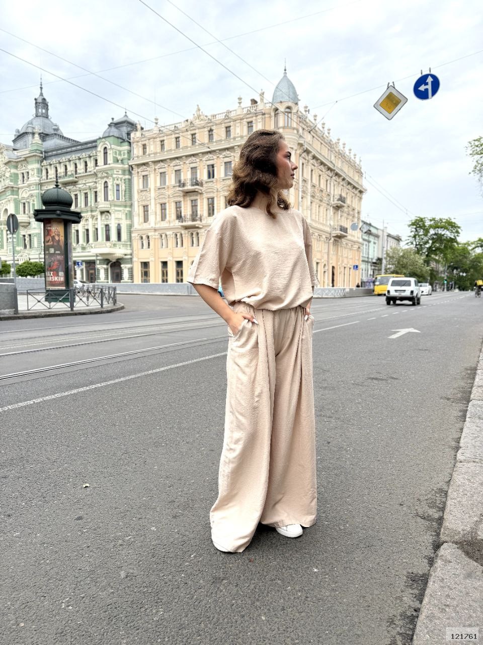 Стильний жіночий костюм, який поєднує комфорт і елегантність. Складається з широких кюлотів і вільної футболки прямого крою. Виконаний із легкої, приємної до тіла тканини — американського крепу, що не мнеться, має м’який матовий блиск і відмінно тримає форму.