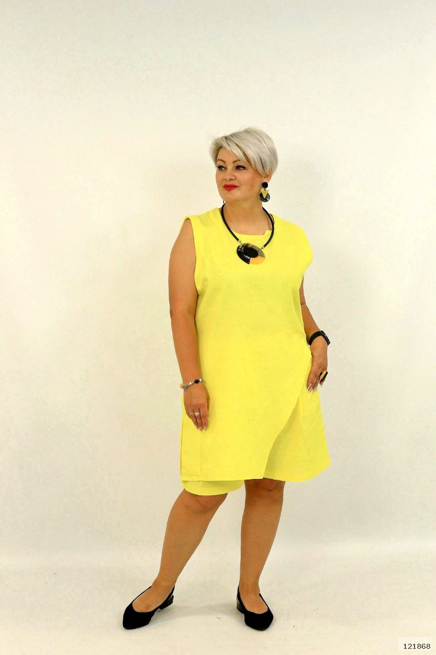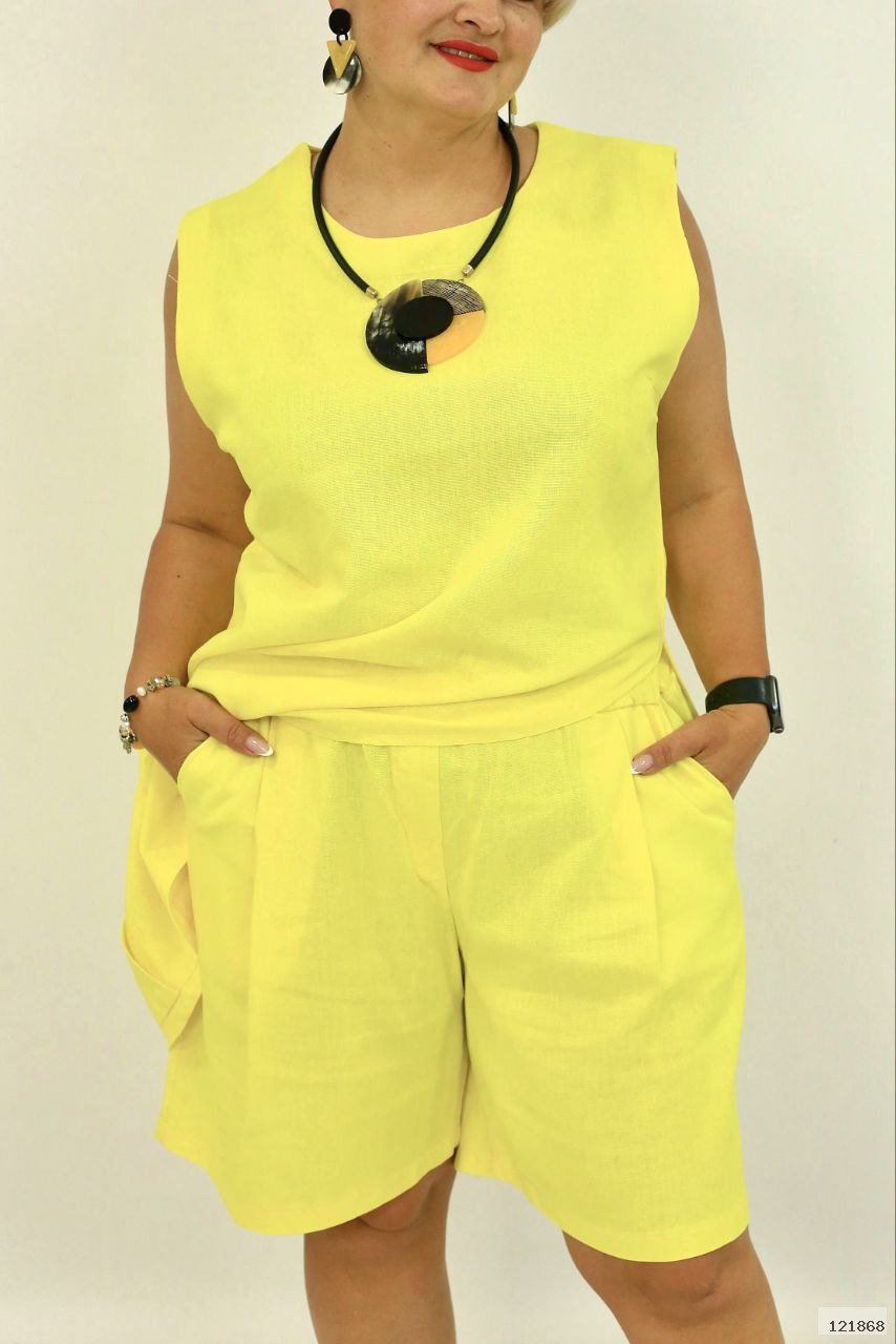 Літній лляний костюм з натуральної тканини люкс якості. Блуза-туніка з фігурним вирізом на боці, та шорти вільного крою. Шорти на резинці з зручними кишенями. Комфорт та краса в одному виробі