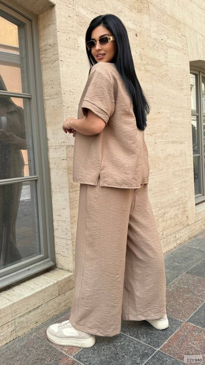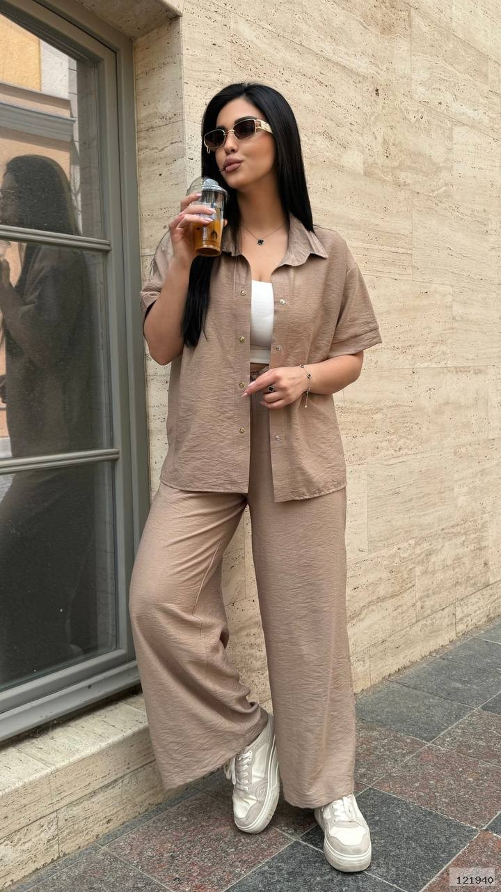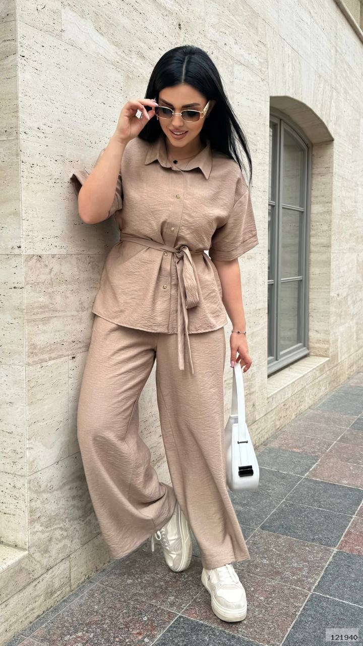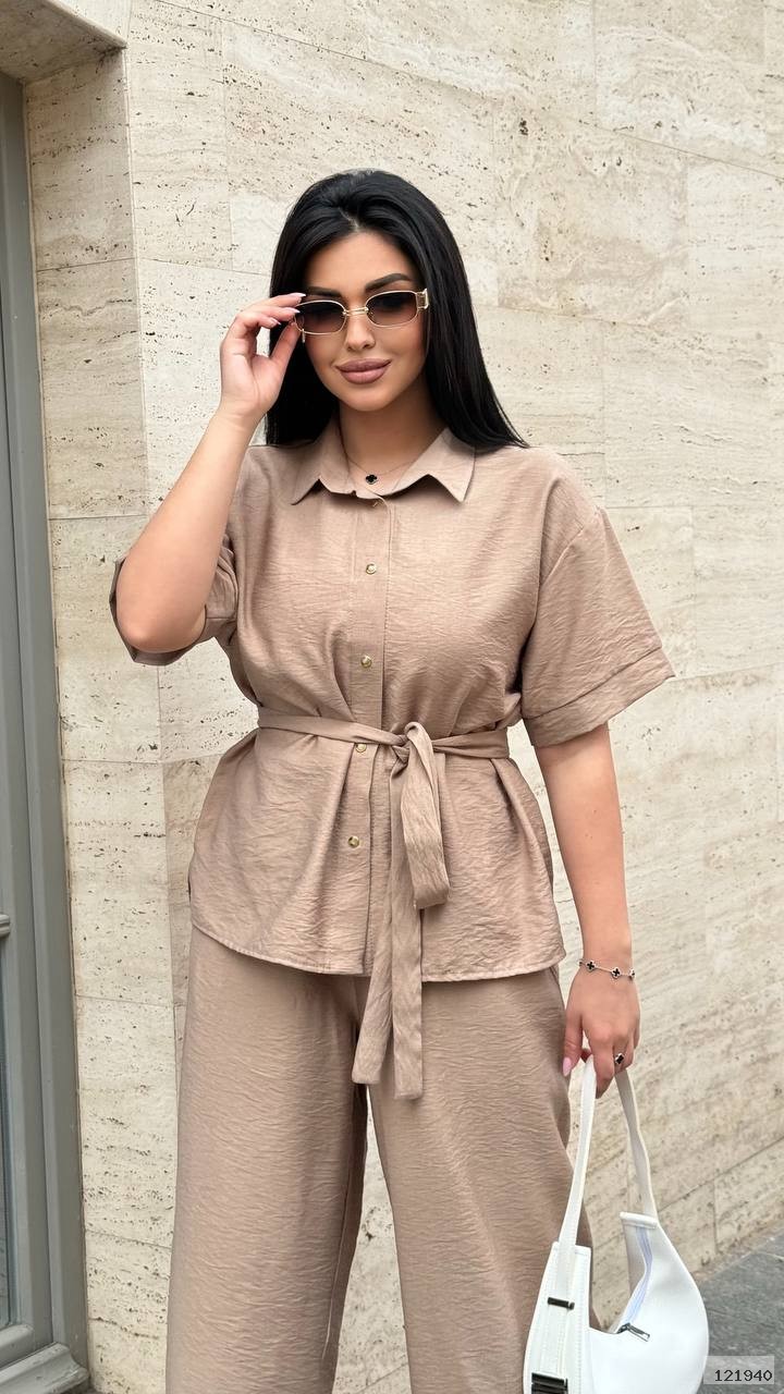 Невагомий та зручний костюм зі штанів та сорочки . Брюки високої посадки, прямого, вільного крою, оздоблені двома кишенями, талія регулюється зав’язками. Сорочка зі спущеним коротким рукавом, застібається на дуже красиві кнопки. Незамінний для денного або вечірнього виходу. Можна носити з паском або без ( пасок в комплекті).