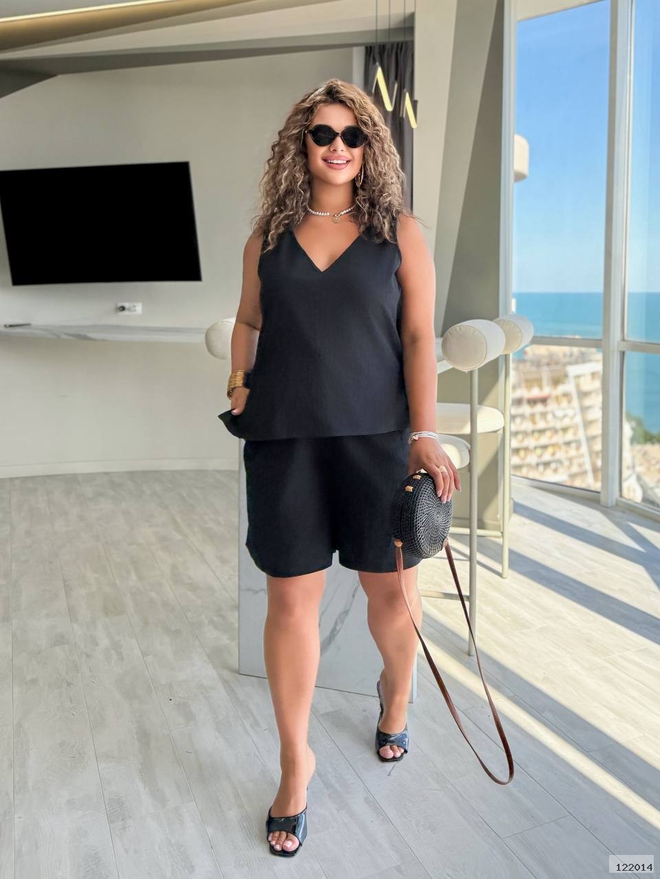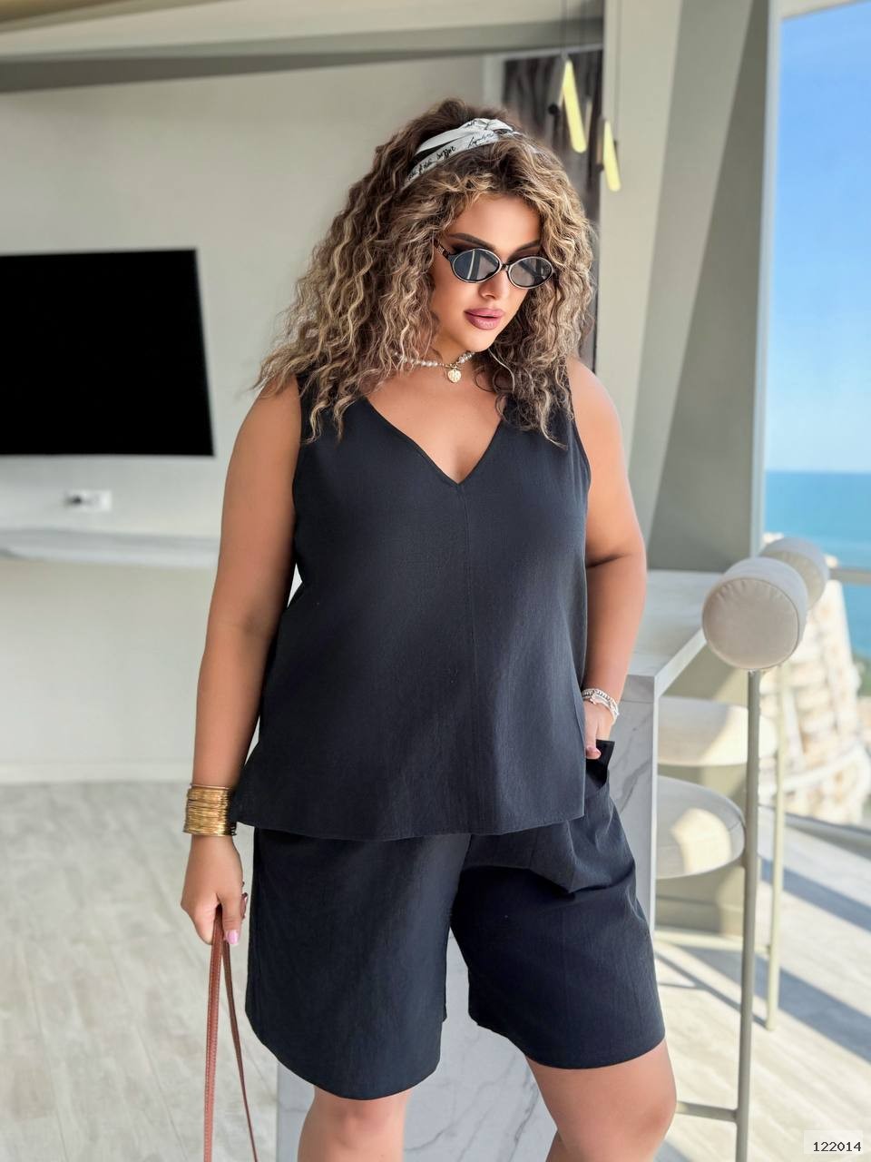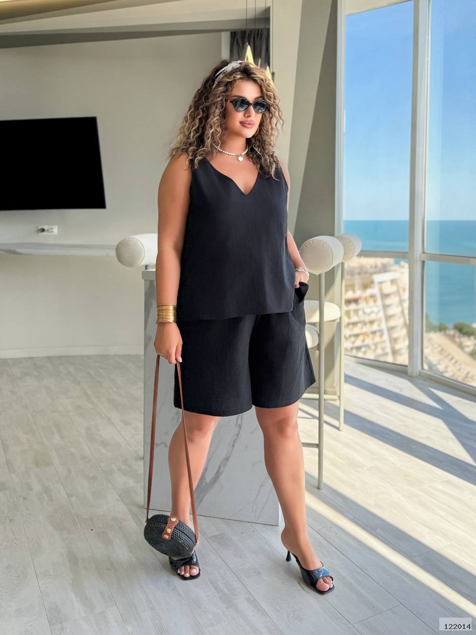 Стильний костюм на спекотне літо. Вільна туніка з розрізами з боків. Шорти з кишенями у бічних швах з посадкою вище середнього на еластичній гумці.