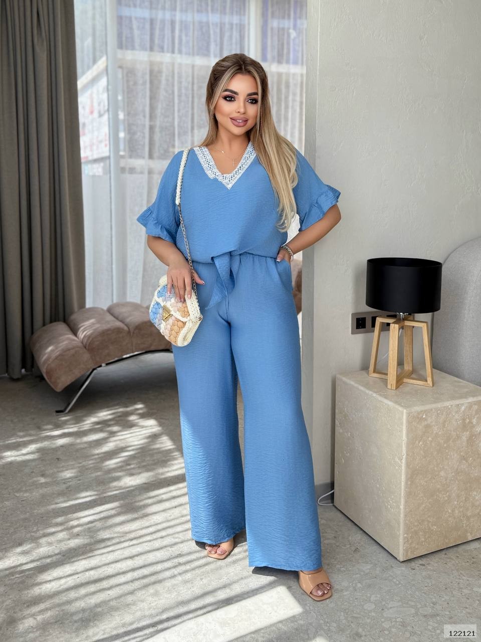Горловина обшита мереживом; на рукаві стильні рюші; в переді є завʼязка, що дозволяє зібрати під себе кофтинку саме так як вам буде до вподоби; штани в стилі палаццо не надто широкі і достатньо довгі; пояс на резинці