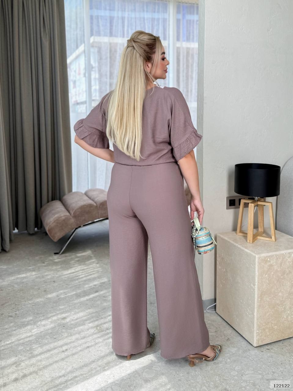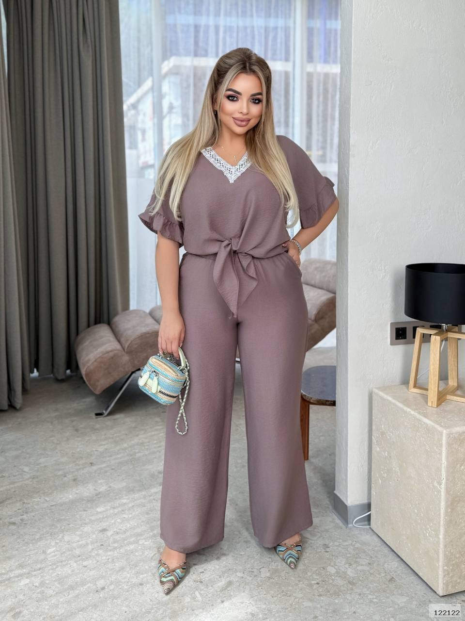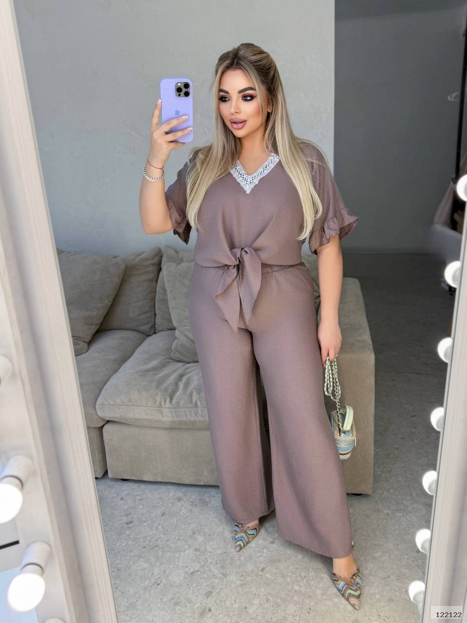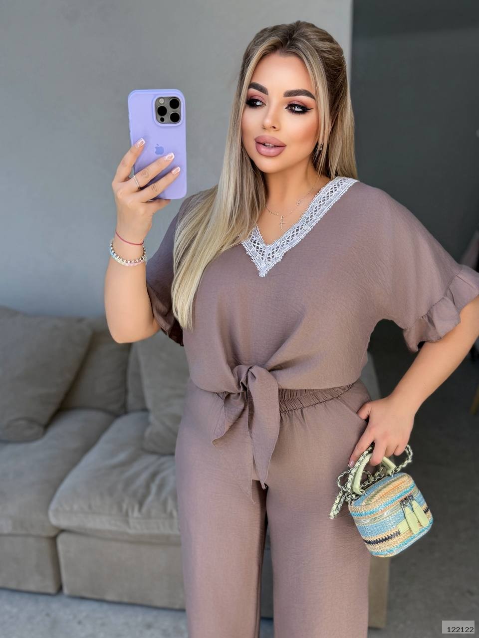 Горловина обшита мереживом; на рукаві стильні рюші; в переді є завʼязка, що дозволяє зібрати під себе кофтинку саме так як вам буде до вподоби; штани в стилі палаццо не надто широкі і достатньо довгі; пояс на резинці